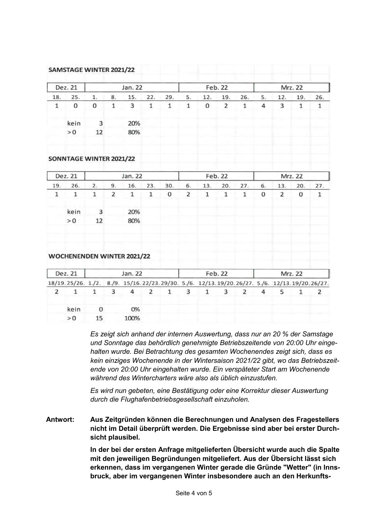 kein einziges Wochenende in der Wintersaison 2021/22 gibt, wo das Betriebszeitende von 20:00 Uhr eingehalten wurde. Ein verspäteter Start am Wochenende