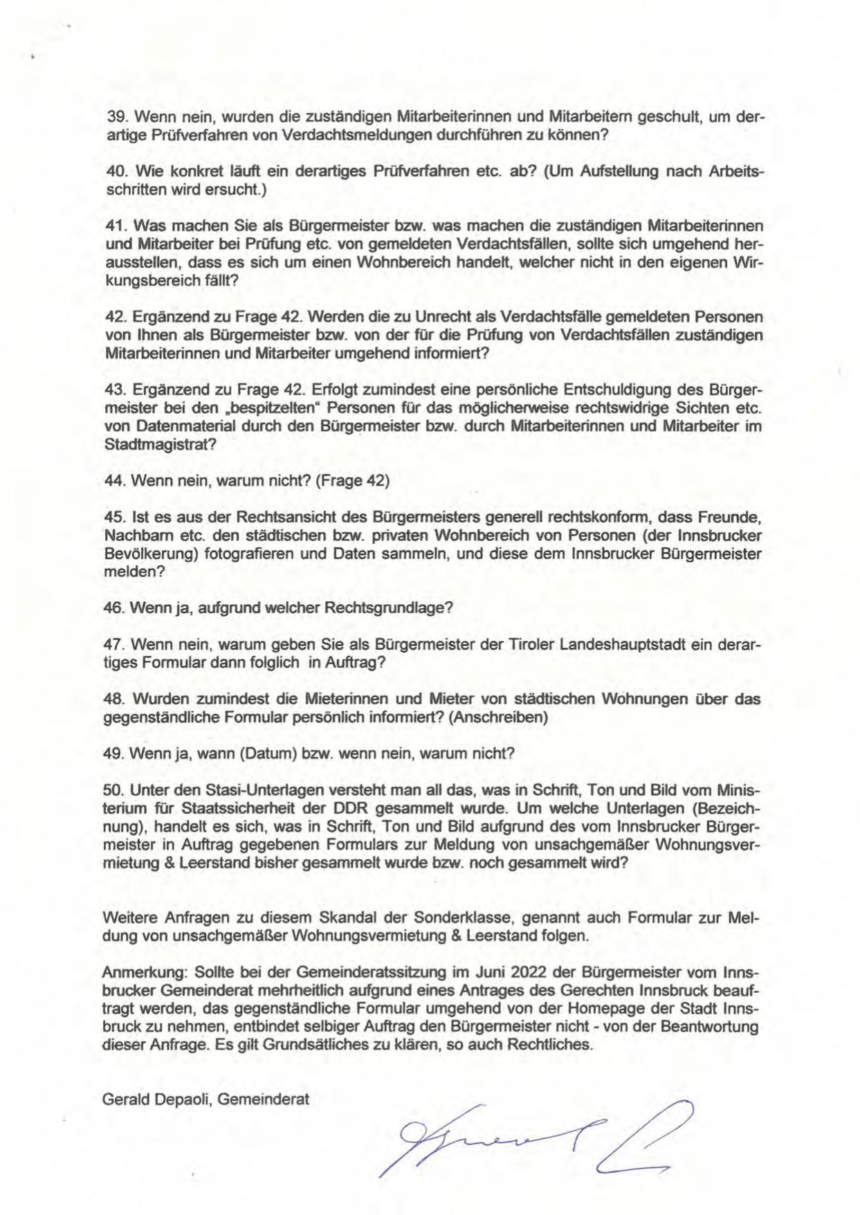 Anmerkung: Sollte bei der Gemeinderatssitzung im Juni 2022 der Bürgermeister vom lnnsbrucker Gemeinderat mehrheitlich aufgrund eines Antrages des Gerechten Innsbruck beauftragt werden, das gegenständliche Formular umgehend von der Homepage der Stadt Innsbruck zu nehmen, entbindet selbiger Auftrag den Bürgermeister nicht - von der Beantwortung
