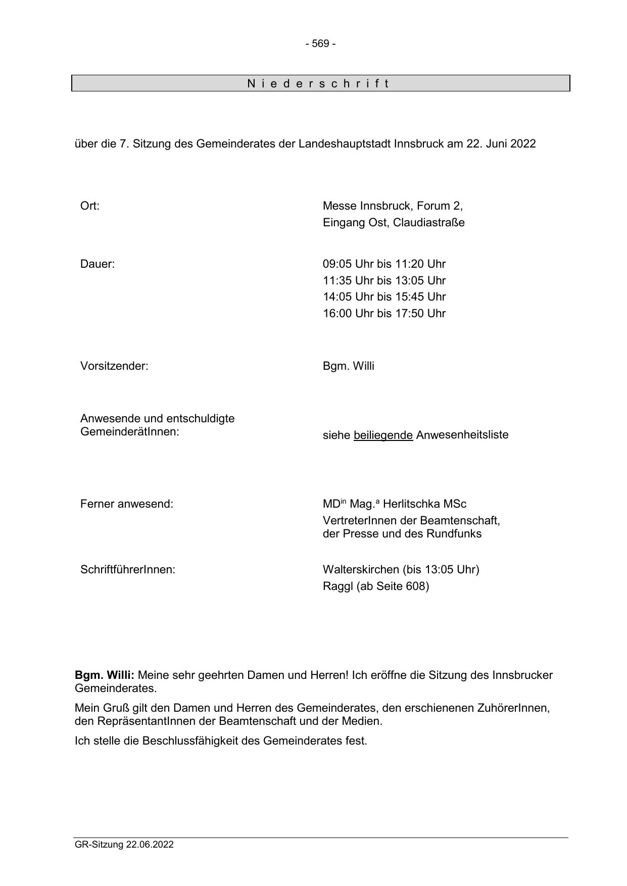 Bgm. Willi: Meine sehr geehrten Damen und Herren! Ich eröffne die Sitzung des Innsbrucker