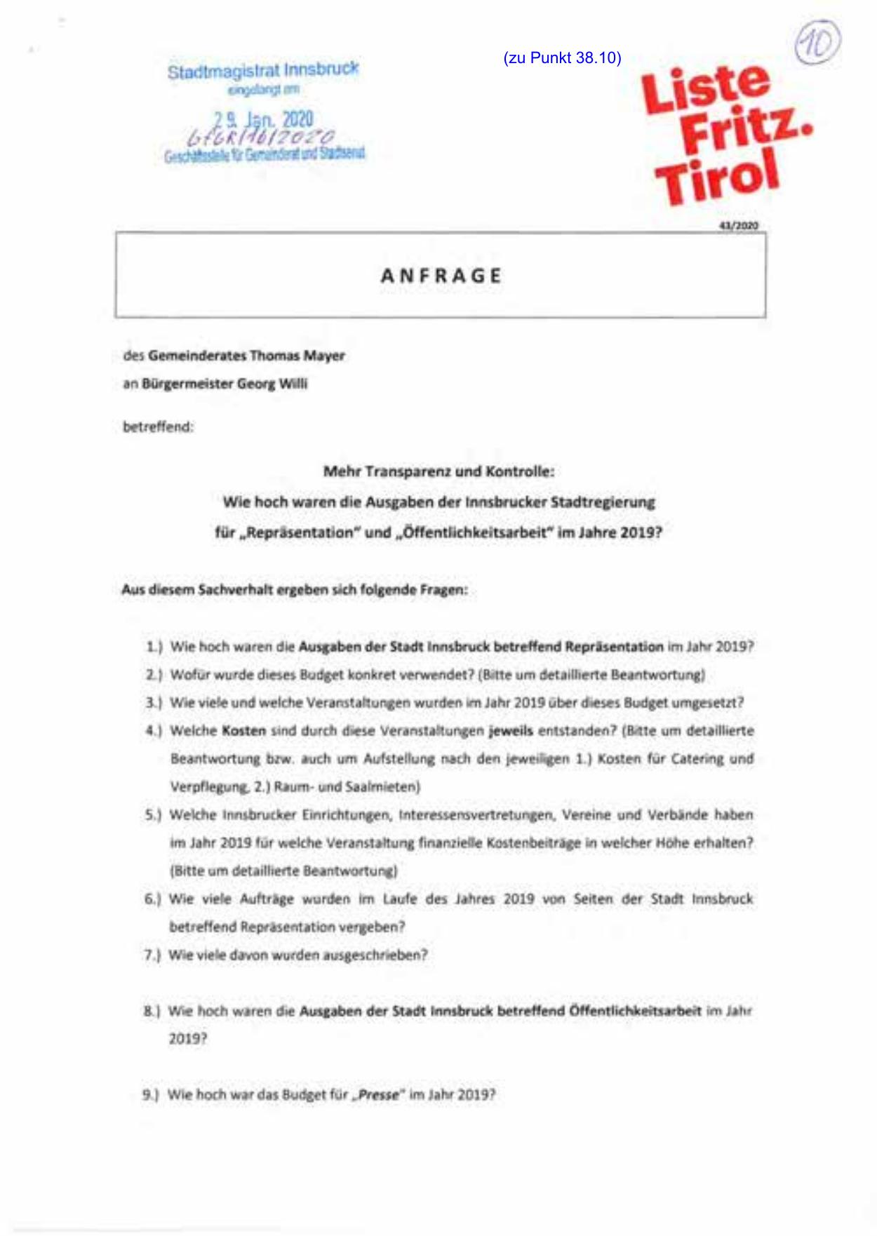 1.) Wie hoch waren die Ausgaben der Stadt Innsbruck betreffend Repräsentation im Jahr 2019?