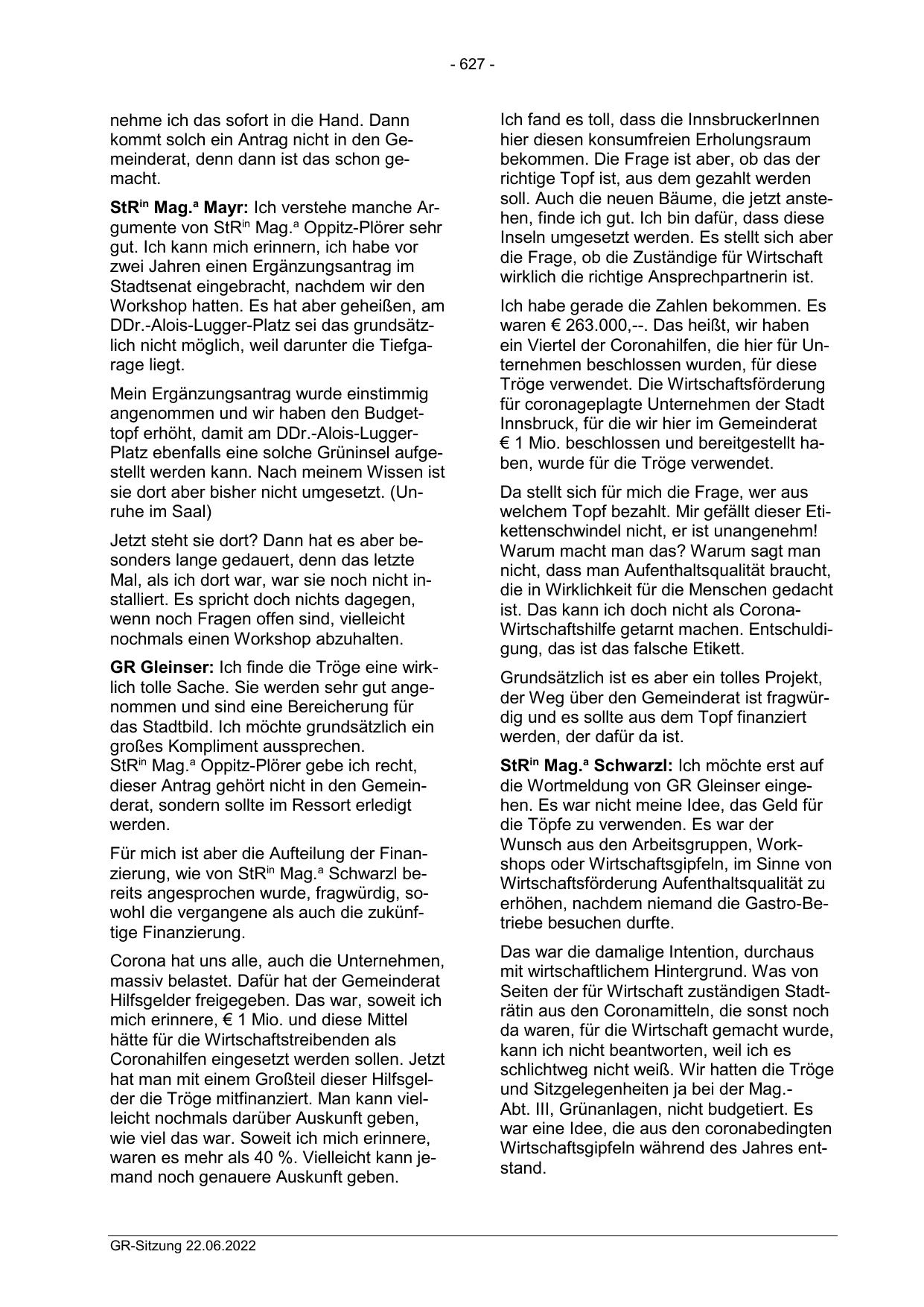 angenommen und wir haben den Budgettopf erhöht, damit am DDr.-Alois-LuggerPlatz ebenfalls eine solche Grüninsel aufgestellt werden kann. Nach meinem Wissen ist