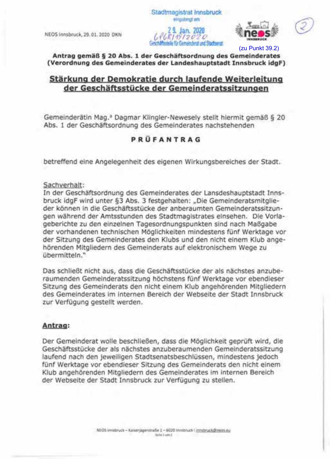In der Geschäftsordnung des Gemeinderates der Lansdeshauptstadt Innsbruck idgF wird unter §3 Abs. 3 festgehalten : ,,Die Gemeinderatsmitglieder können in die Geschäftsstücke der anberaumten Gemeinderatssitzungen während der Amtsstunden des Stadtmagistrates einsehen. Die Vorlageberichte zu den einzelnen Tagesordnungspunkten sind nach Maßgabe