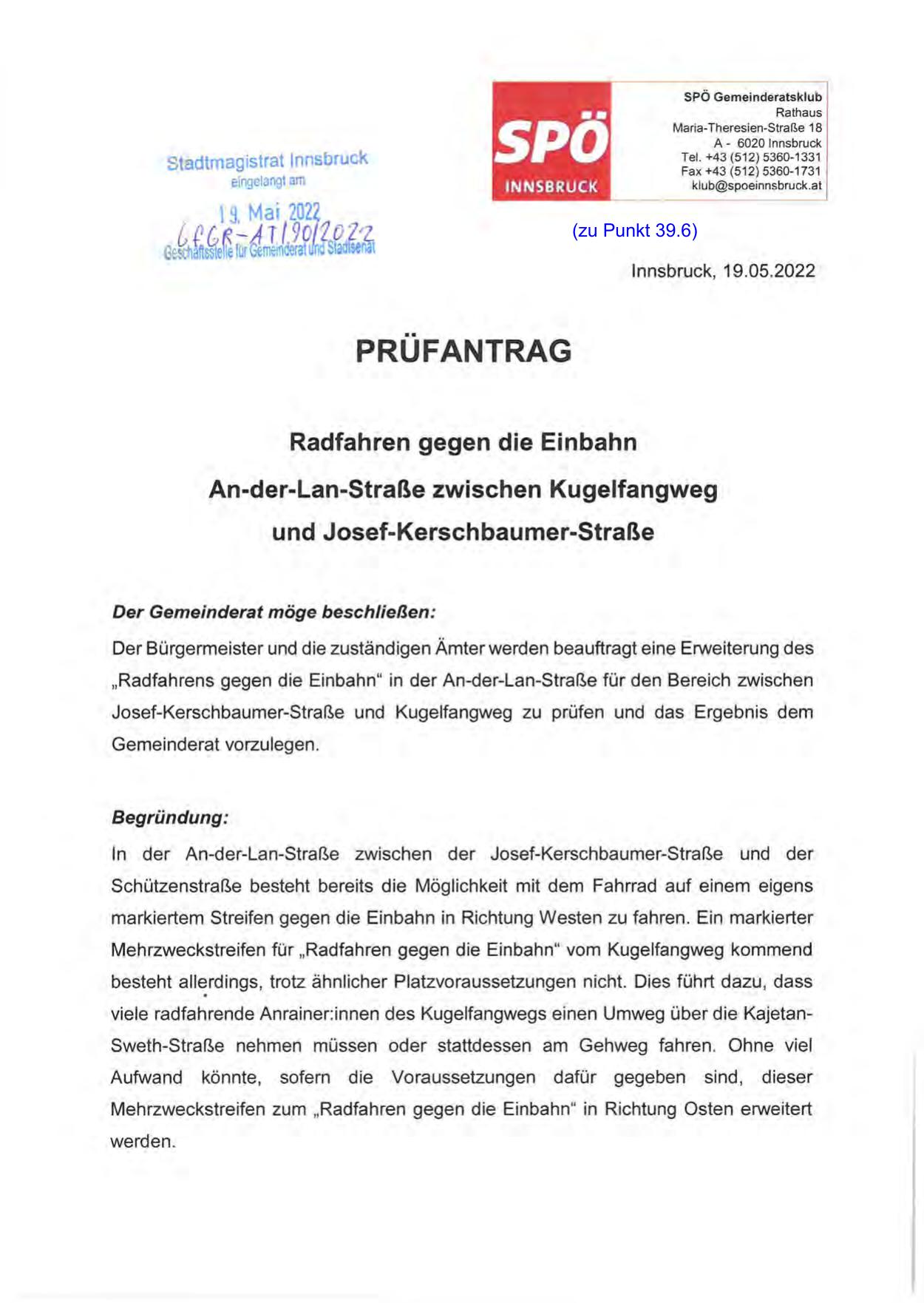 Josef-Kerschbaumer-Straße und Kugelfangweg zu prüfen und das Ergebnis dem