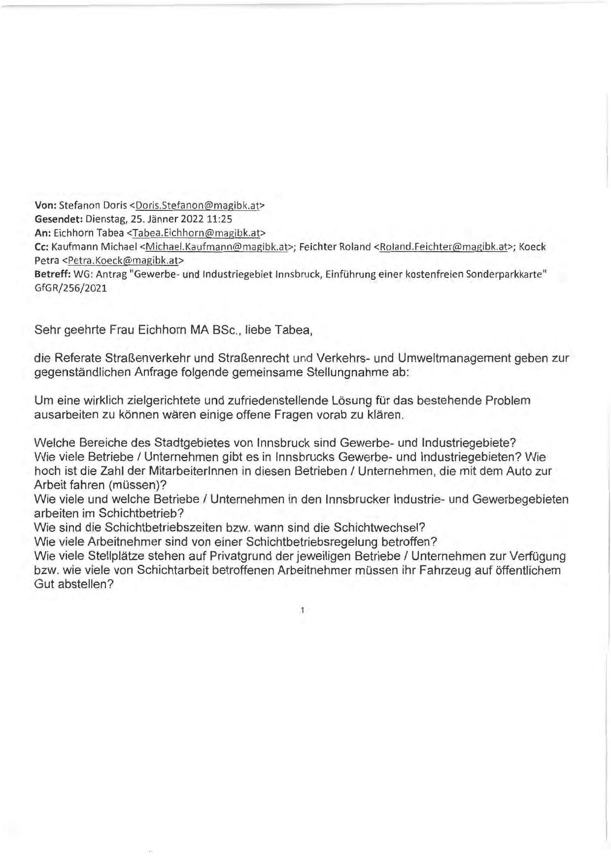 Betreff: WG: Antrag "Gewerbe- und Industriegebiet Innsbruck, Einführung einer kostenfreien Sonderparkkarte"
