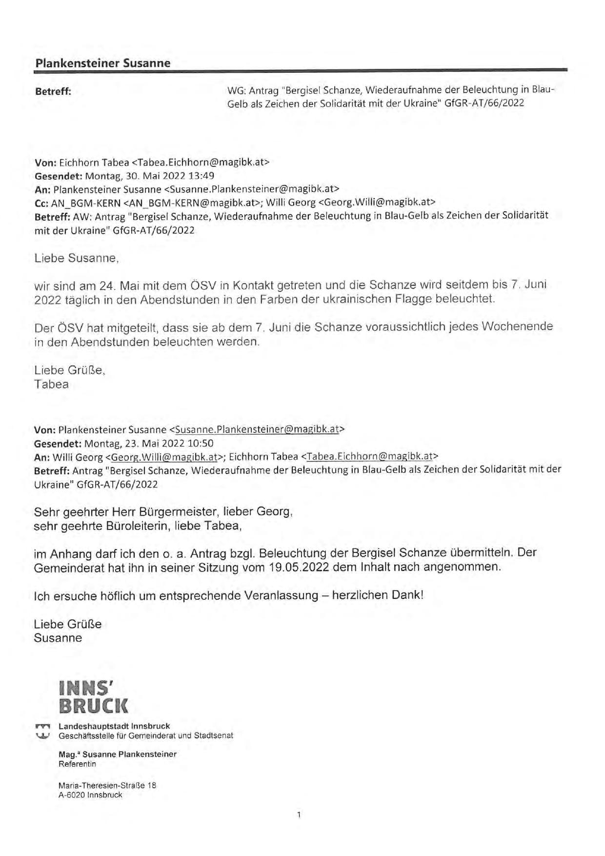 Betreff: AW: Antrag "Bergisel Schanze, Wiederaufnahme der Beleuchtung in Blau-Gelb als Zeichen der Solidarität
