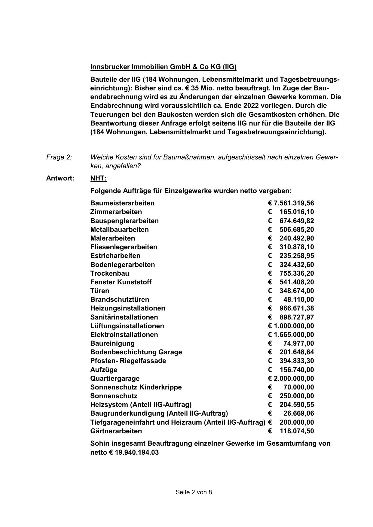 Bauteile der IIG (184 Wohnungen, Lebensmittelmarkt und Tagesbetreuungseinrichtung): Bisher sind ca. € 35 Mio. netto beauftragt. Im Zuge der Bauendabrechnung wird es zu Änderungen der einzelnen Gewerke kommen. Die
