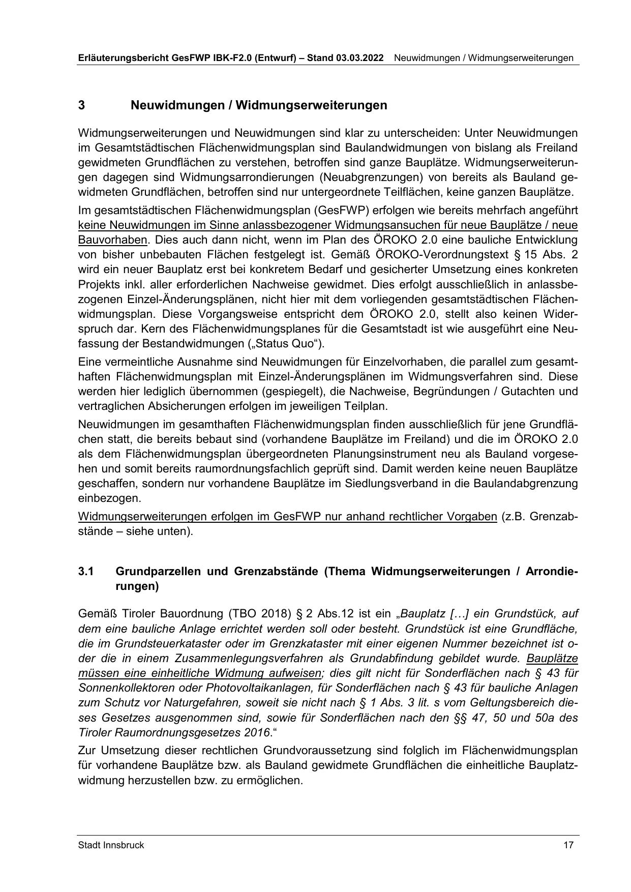 Projekts inkl. aller erforderlichen Nachweise gewidmet. Dies erfolgt ausschließlich in anlassbezogenen Einzel-Änderungsplänen, nicht hier mit dem vorliegenden gesamtstädtischen Flächenwidmungsplan. Diese Vorgangsweise entspricht dem ÖROKO 2.0, stellt also keinen Widerspruch dar. Kern des Flächenwidmungsplanes für die Gesamtstadt ist wie ausgeführt eine Neufassung der Bestandwidmungen („Status Quo“).