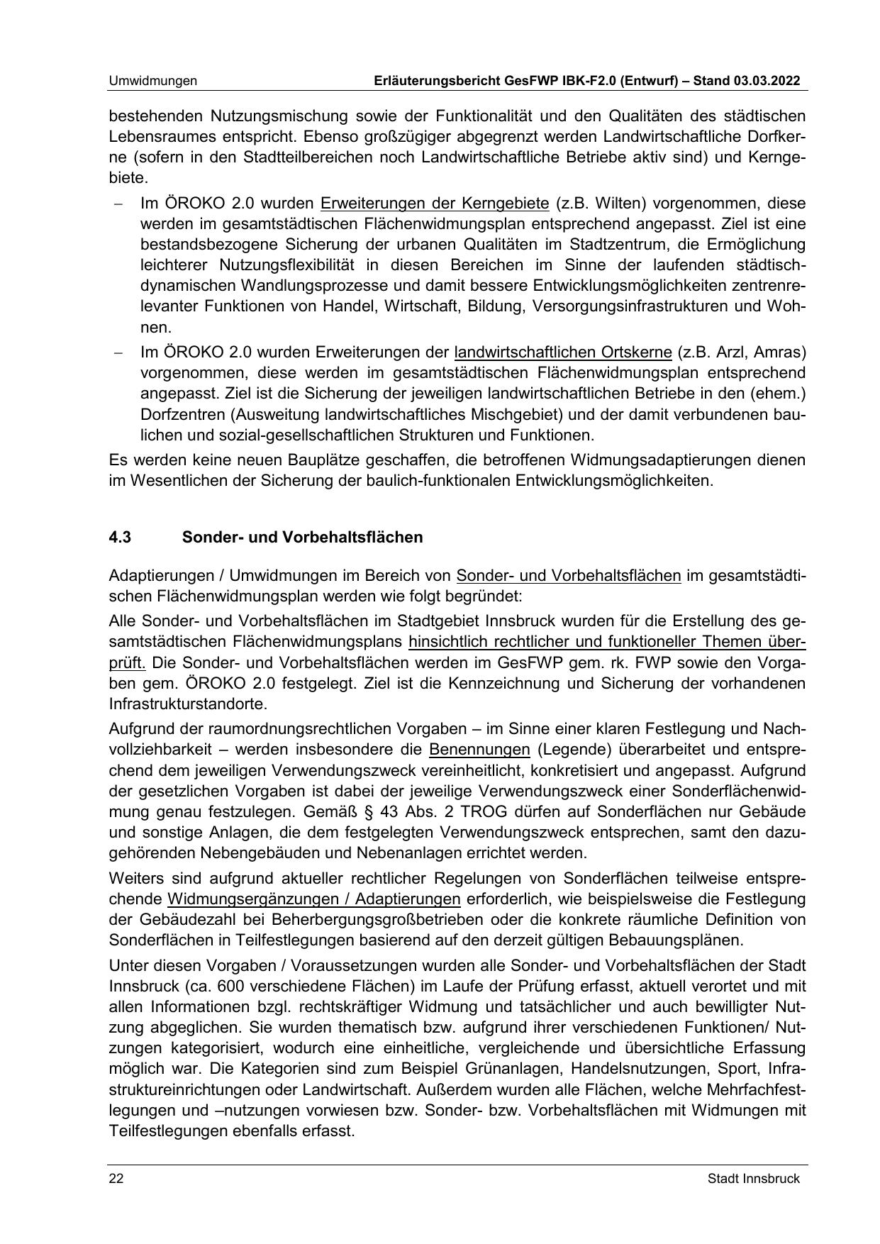 Alle Sonder- und Vorbehaltsflächen im Stadtgebiet Innsbruck wurden für die Erstellung des gesamtstädtischen Flächenwidmungsplans hinsichtlich rechtlicher und funktioneller Themen überprüft. Die Sonder- und Vorbehaltsflächen werden im GesFWP gem. rk. FWP sowie den Vorgaben gem. ÖROKO 2.0 festgelegt. Ziel ist die Kennzeichnung und Sicherung der vorhandenen