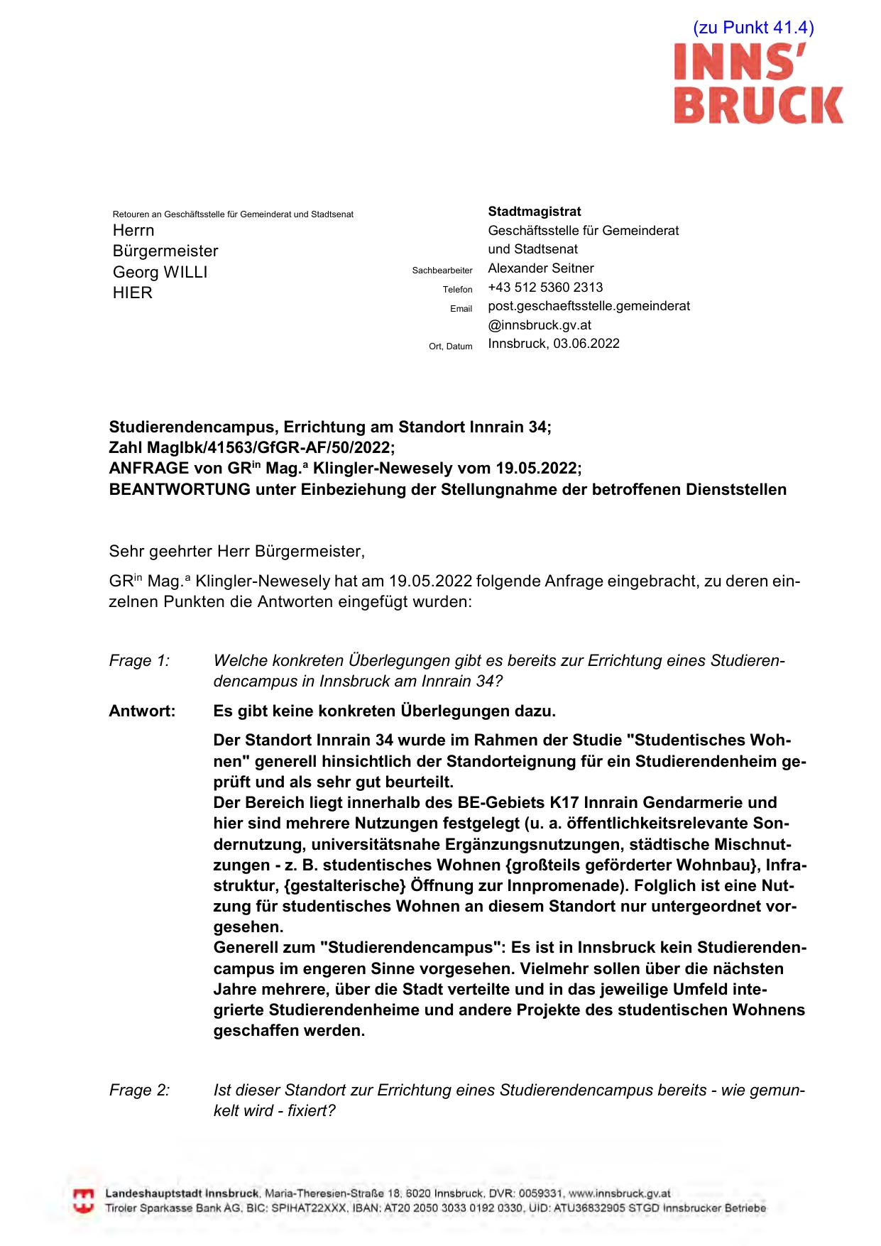 Welche konkreten Überlegungen gibt es bereits zur Errichtung eines Studierendencampus in Innsbruck am Innrain 34?