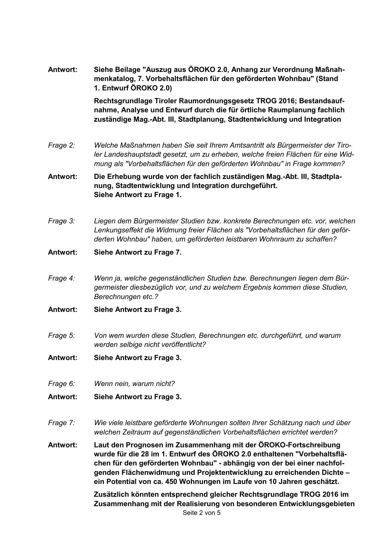 Welche Maßnahmen haben Sie seit Ihrem Amtsantritt als Bürgermeister der Tiroler Landeshauptstadt gesetzt, um zu erheben, welche freien Flächen für eine Widmung als "Vorbehaltsflächen für den geförderten Wohnbau" in Frage kommen?