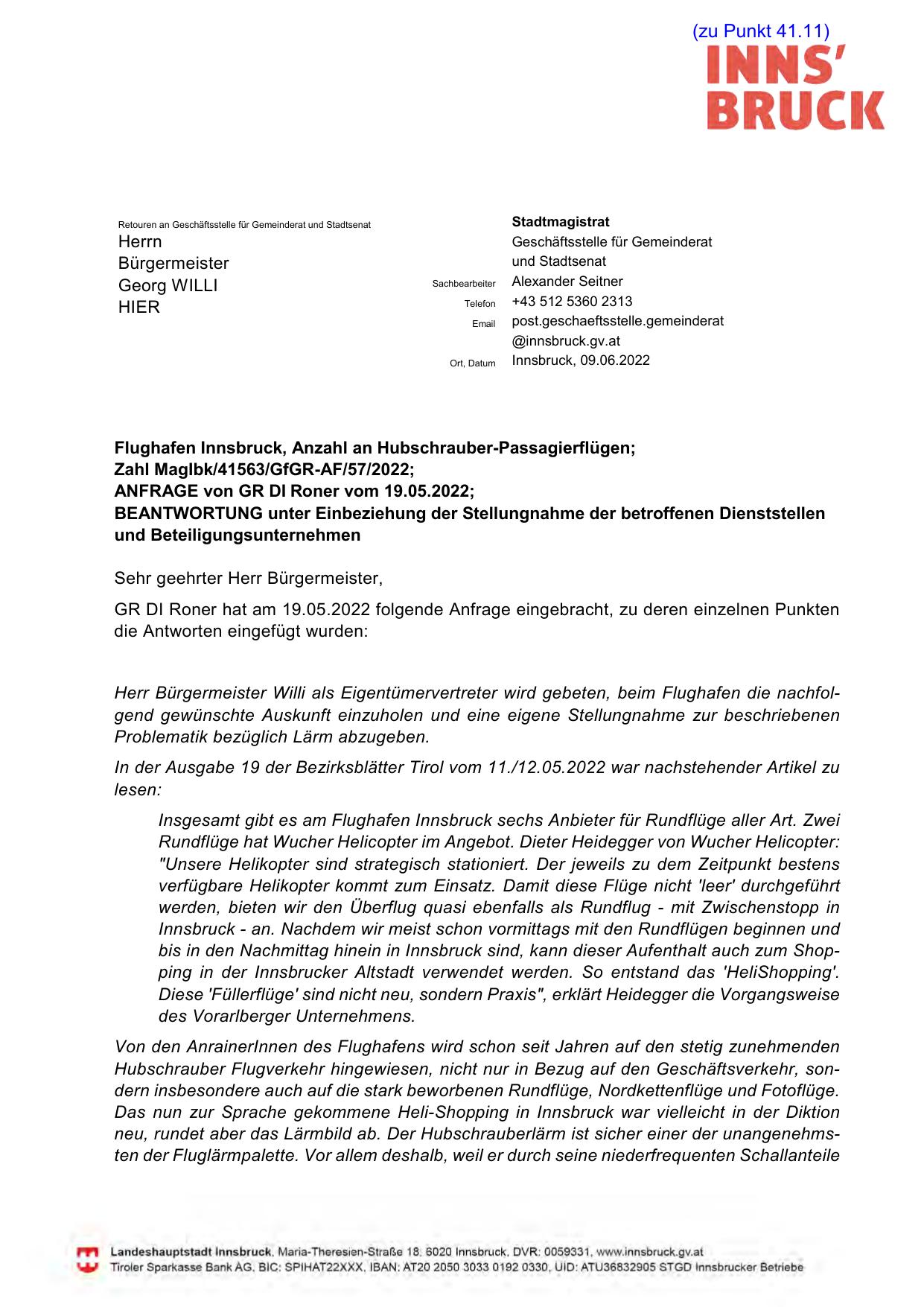 GR DI Roner hat am 19.05.2022 folgende Anfrage eingebracht, zu deren einzelnen Punkten