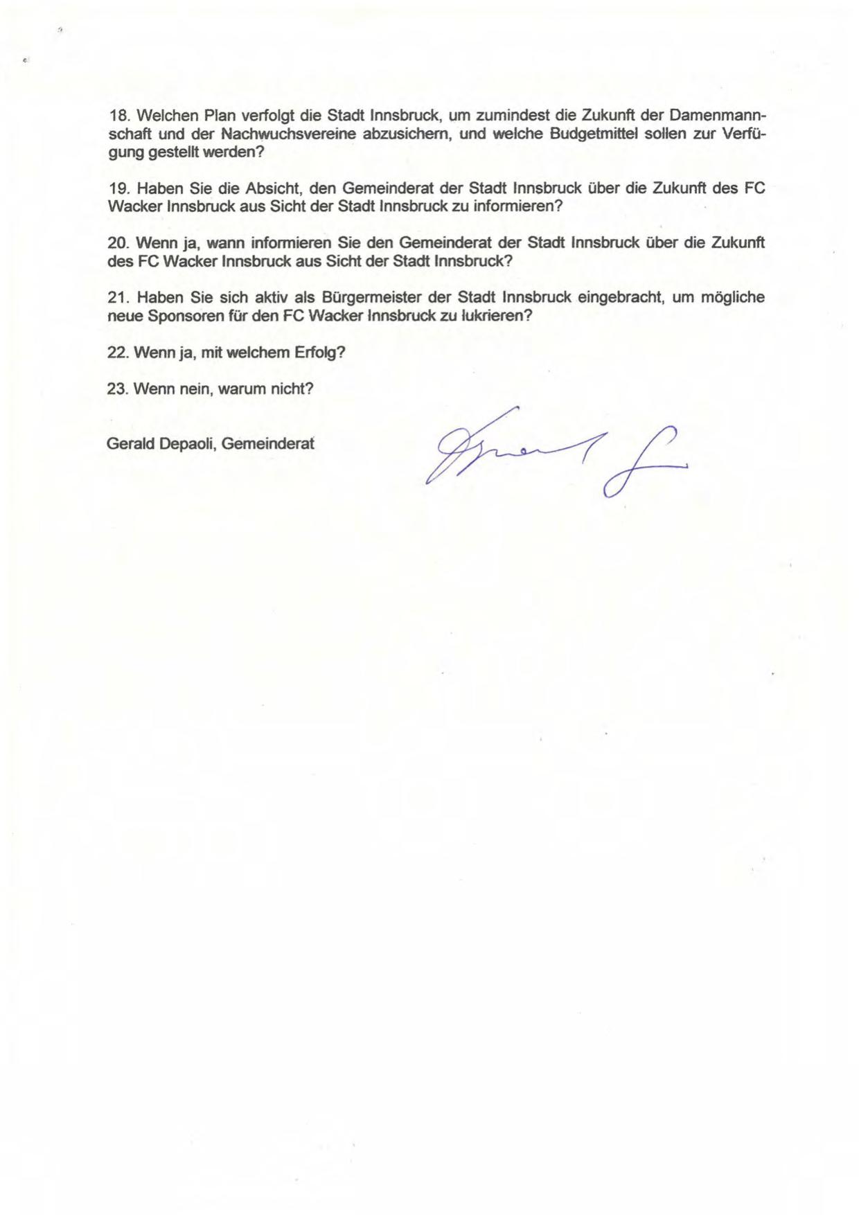 19. Haben Sie die Absicht, den Gemeinderat der Stadt Innsbruck über die Zukunft des FC