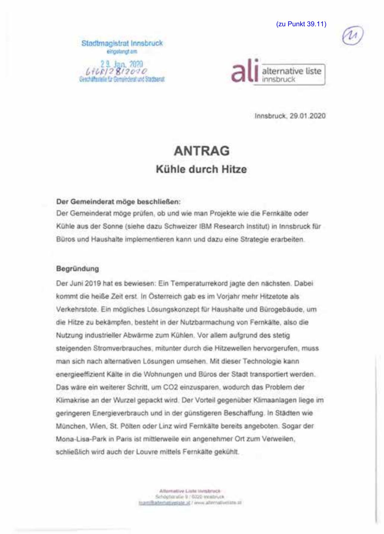 Der Gemeinderat möge prüfen , ob und wie man Projekte wie die Fernkälte oder