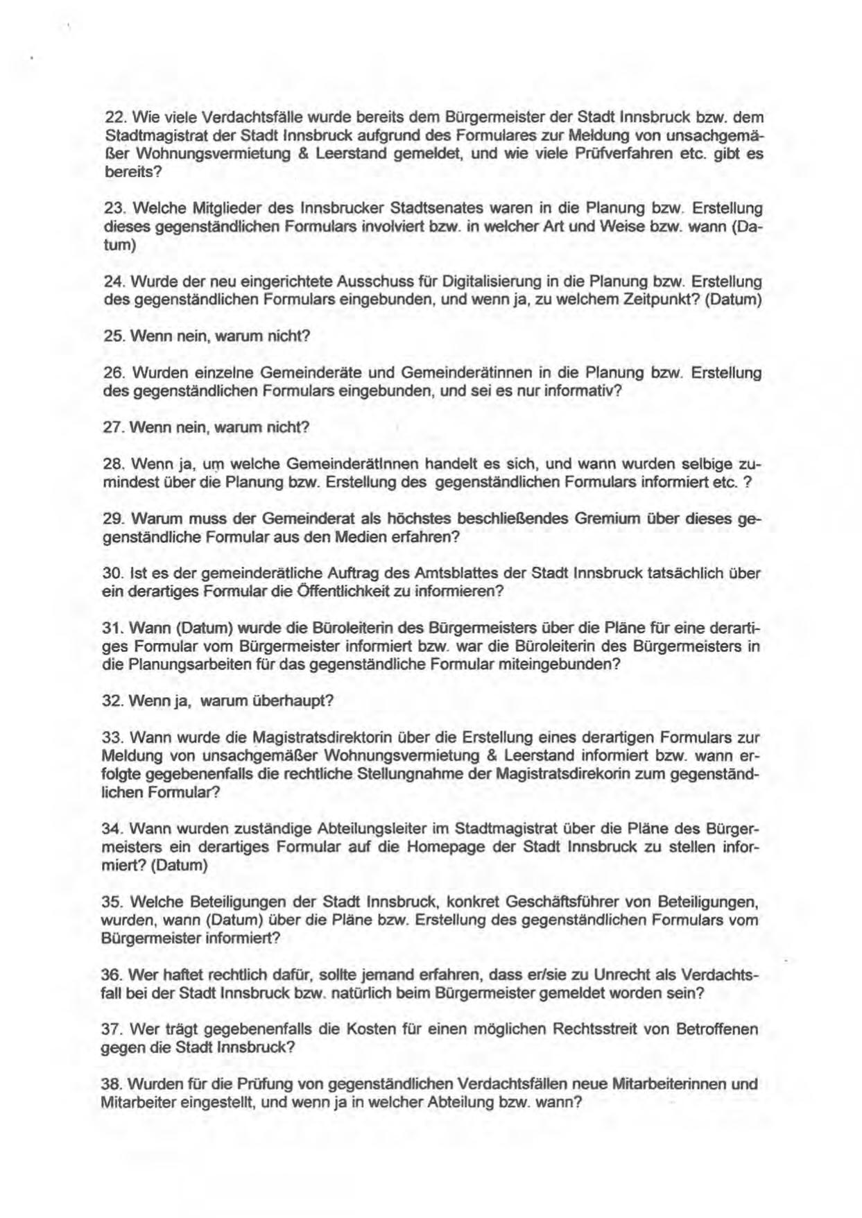 22. Wie viele Verdachtsfälle wurde bereits dem Bürgermeister der Stadt Innsbruck bzw. dem