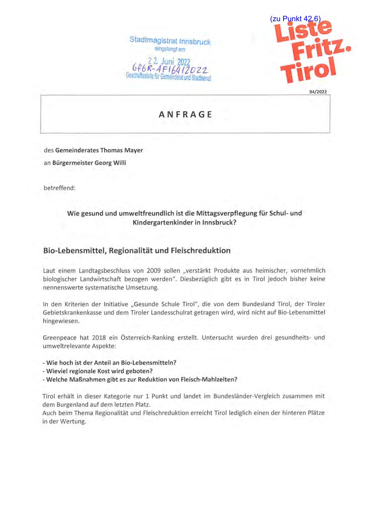 Gebietskrankenkasse und dem Tiroler Landesschulrat getragen wird, wird nicht auf Bio-Lebensmittel