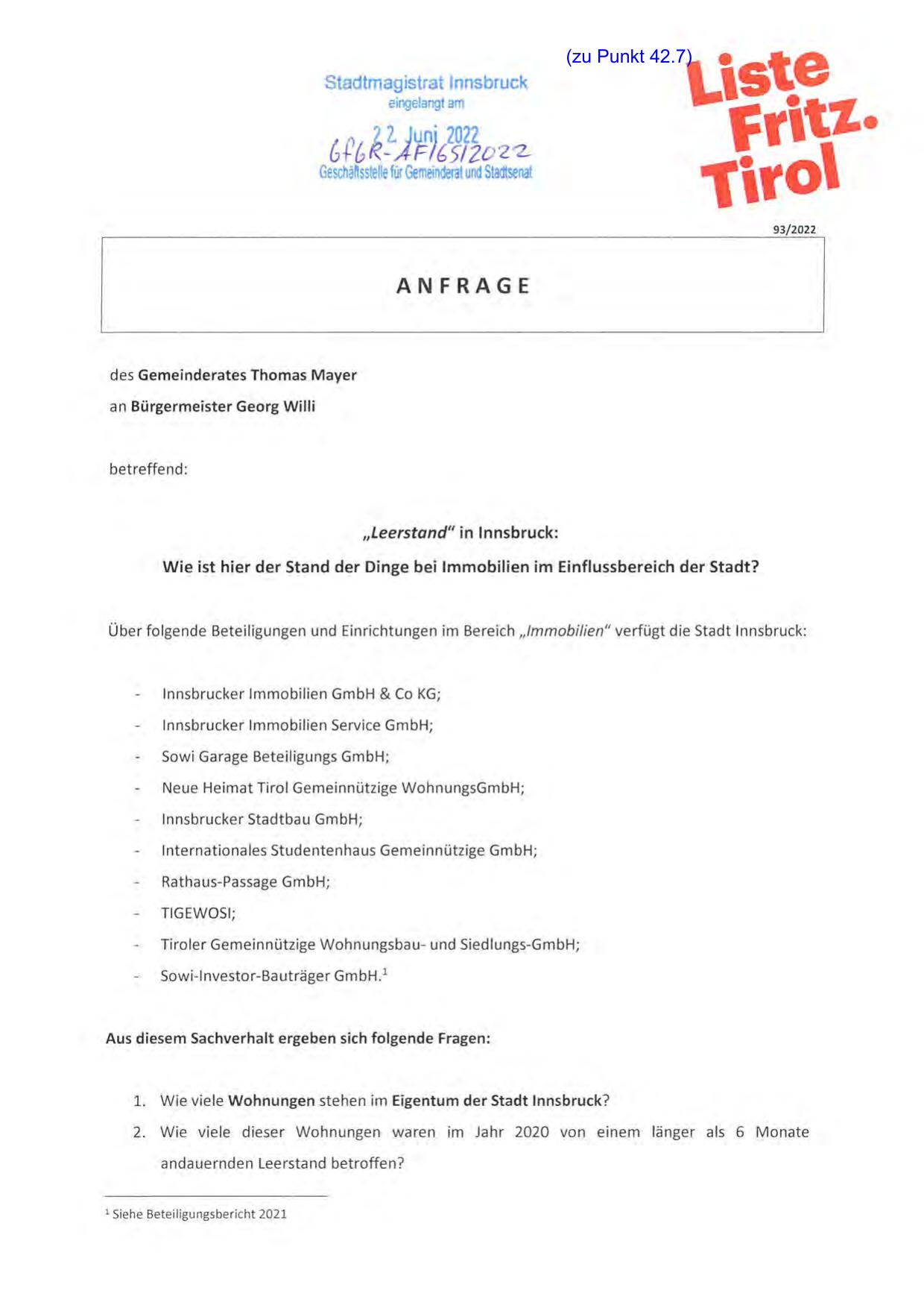 Wie viele Wohnungen stehen im Eigentum der Stadt Innsbruck?