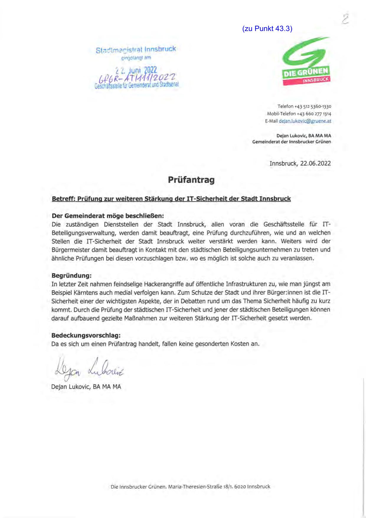 Stellen die IT-Sicherheit der Stadt Innsbruck weiter verstärkt werden kann. Weiters wird der