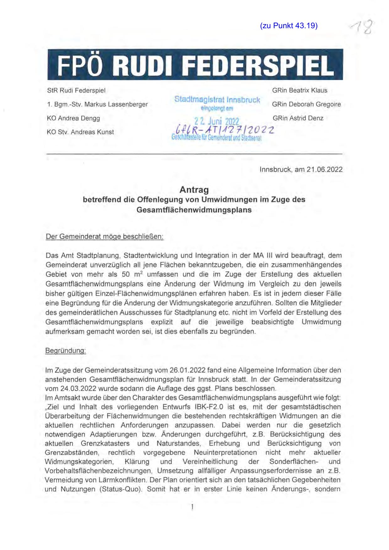 anstehenden Gesamtflächenwidmungsplan für Innsbruck statt. In der Gemeinderatssitzung