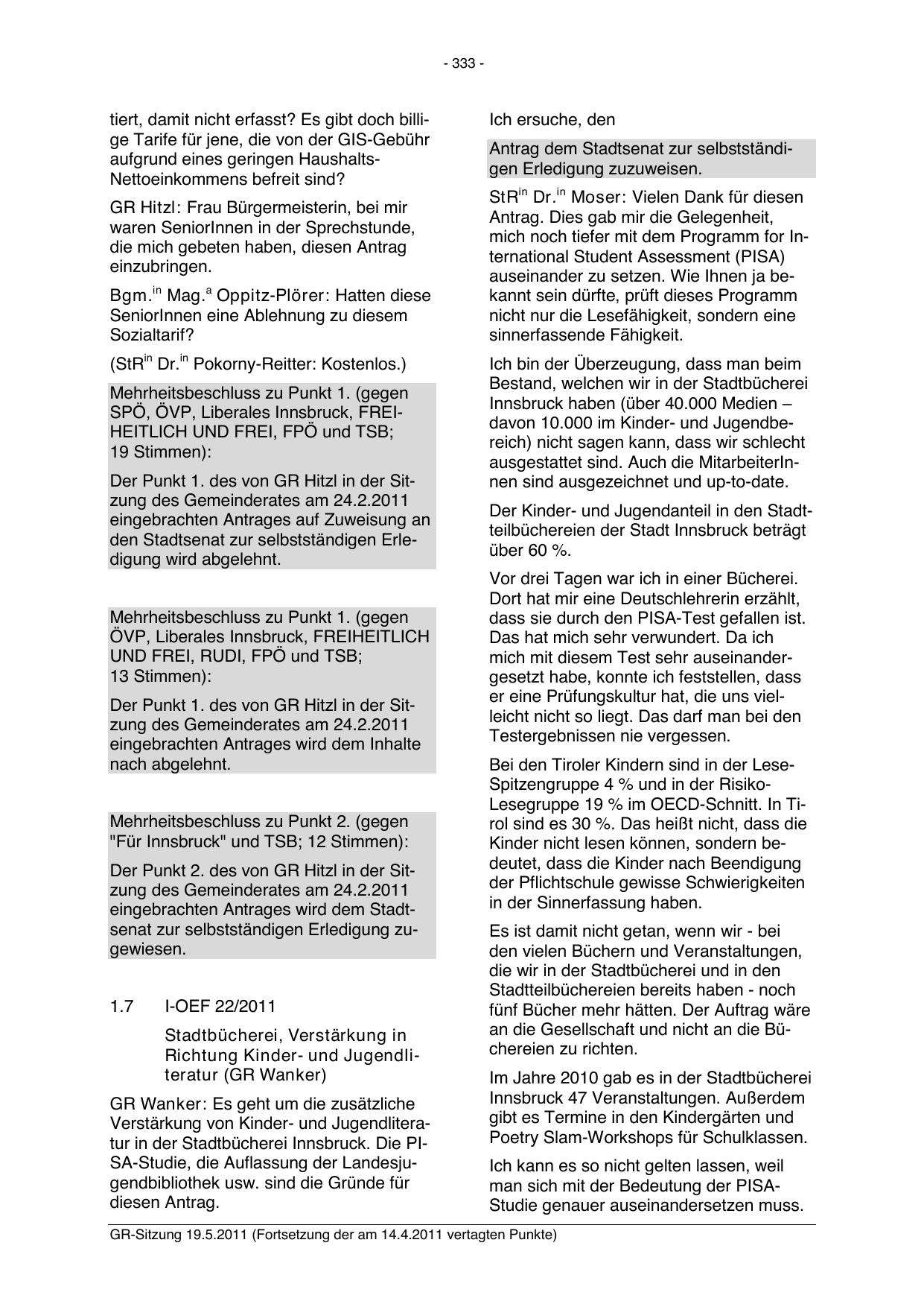 GR-Sitzung 19.5.2011 (Fortsetzung der am 14.4.2011 vertagten Punkte)