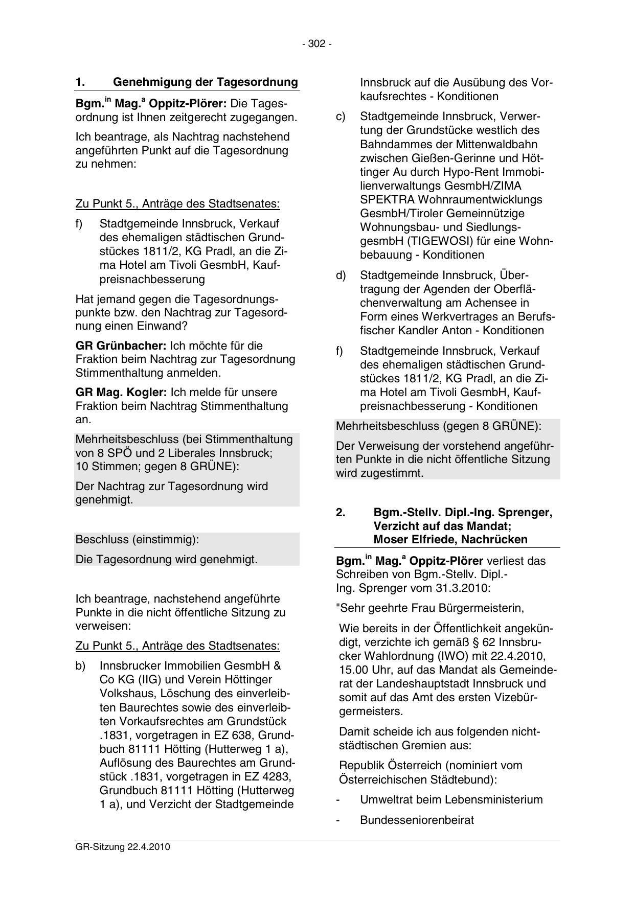 Wie bereits in der Öffentlichkeit angekündigt, verzichte ich gemäß § 62 Innsbrucker Wahlordnung (IWO) mit 22.4.2010,