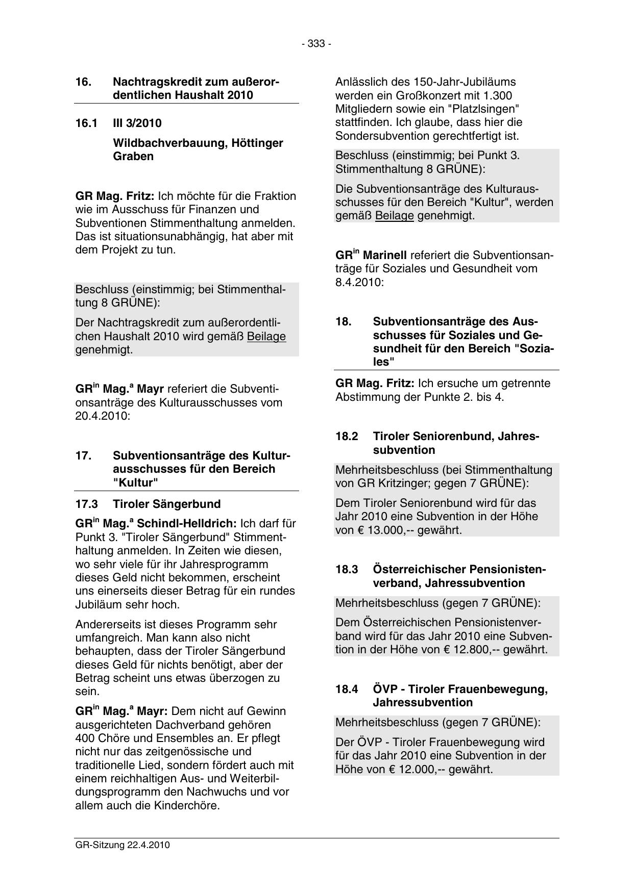 Dem Österreichischen Pensionistenverband wird für das Jahr 2010 eine Subvention in der Höhe von € 12.800,-- gewährt.