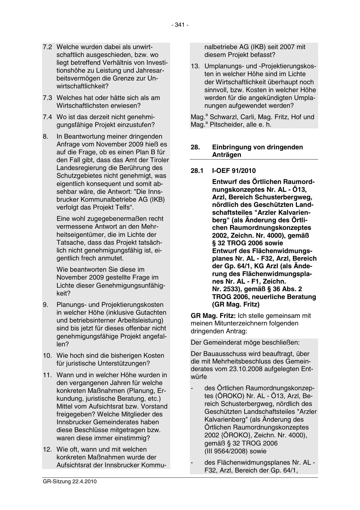 Aufsichtsrat der Innsbrucker KommuGR-Sitzung 22.4.2010