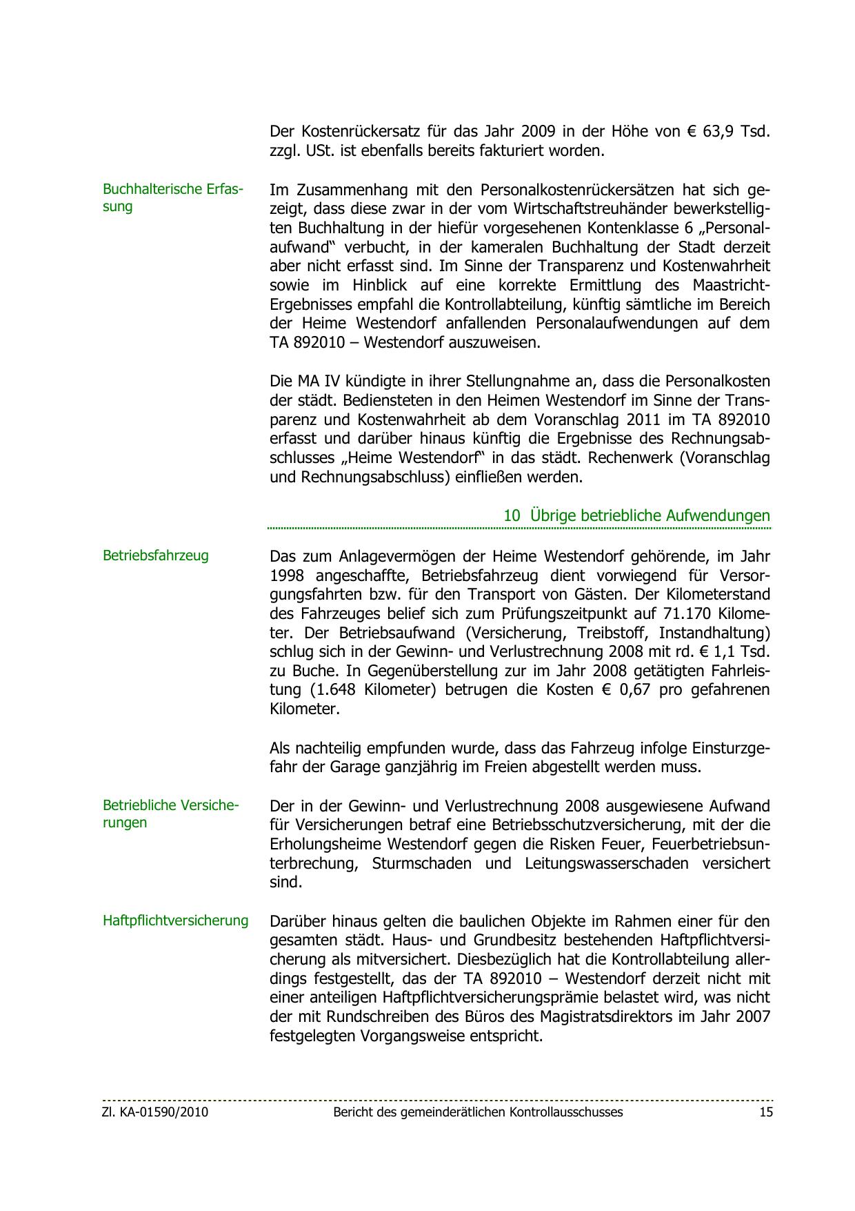 der städt. Bediensteten in den Heimen Westendorf im Sinne der Transparenz und Kostenwahrheit ab dem Voranschlag 2011 im TA 892010
