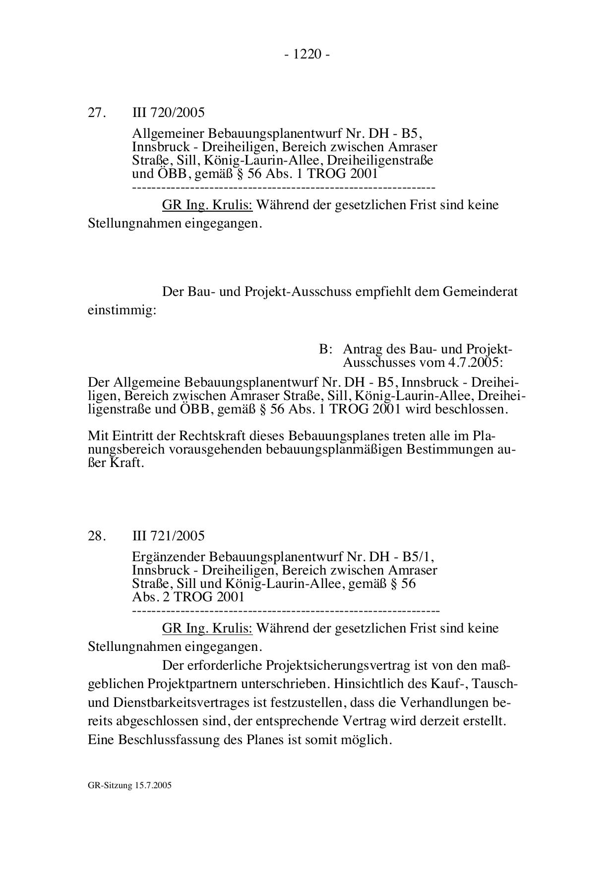 Der Allgemeine Bebauungsplanentwurf Nr. DH - B5, Innsbruck - Dreiheiligen, Bereich zwischen Amraser Straße, Sill, König-Laurin-Allee, Dreiheiligenstraße und ÖBB, gemäß § 56 Abs. 1 TROG 2001 wird beschlossen.