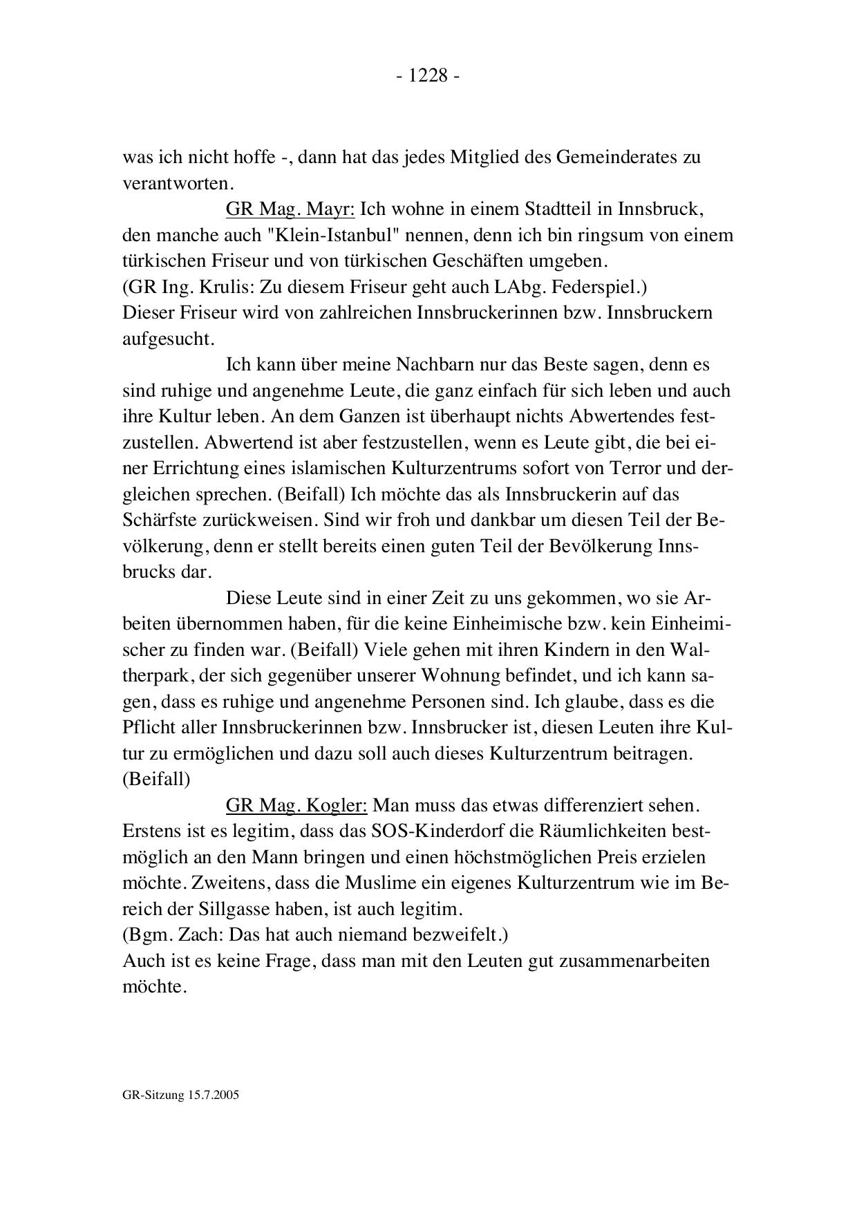 ihre Kultur leben. An dem Ganzen ist überhaupt nichts Abwertendes festzustellen. Abwertend ist aber festzustellen, wenn es Leute gibt, die bei einer Errichtung eines islamischen Kulturzentrums sofort von Terror und dergleichen sprechen. (Beifall) Ich möchte das als Innsbruckerin auf das