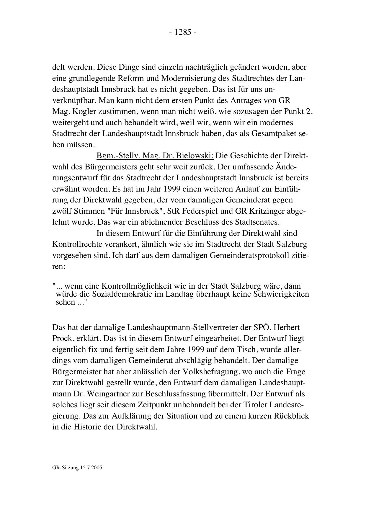 Bgm.-Stellv. Mag. Dr. Bielowski: Die Geschichte der Direktwahl des Bürgermeisters geht sehr weit zurück. Der umfassende Änderungsentwurf für das Stadtrecht der Landeshauptstadt Innsbruck ist bereits