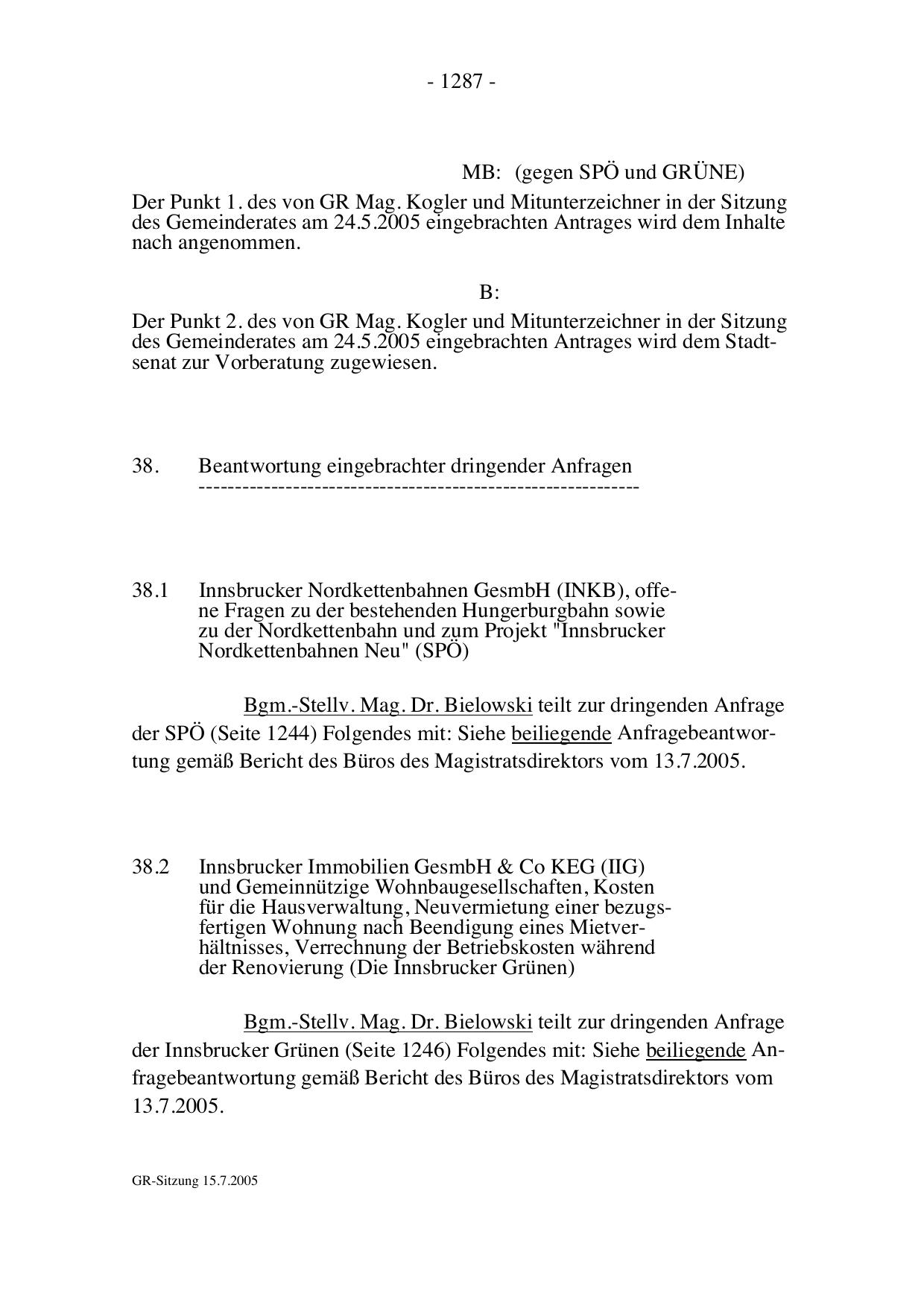 der Innsbrucker Grünen (Seite 1246) Folgendes mit: Siehe beiliegende Anfragebeantwortung gemäß Bericht des Büros des Magistratsdirektors vom