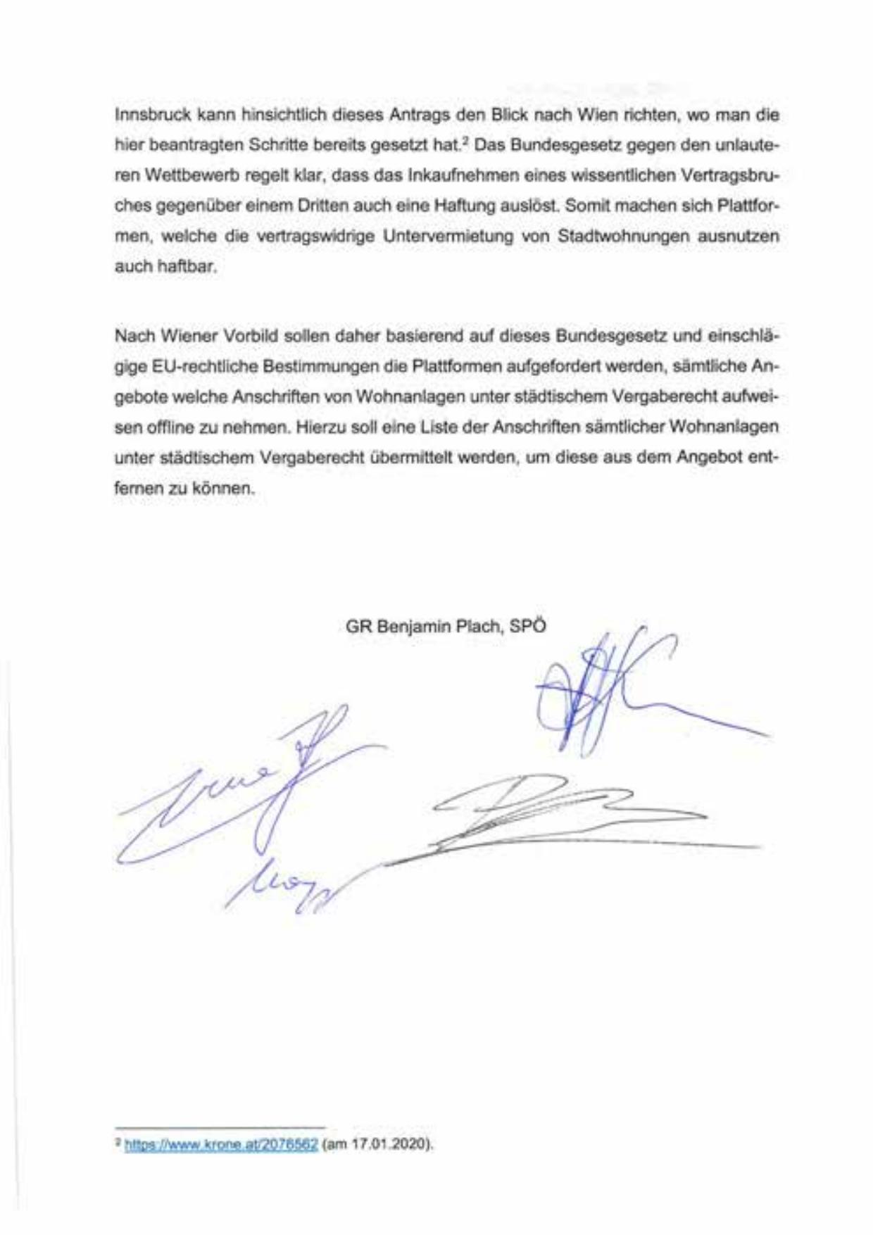hier beantragten Schritte bereits gesetzt hat. 2 Das Bundesgesetz gegen den unlauteren Wettbewerb regelt klar, dass das lnkaufnehmen eines wissentlichen Vertragsbruches gegenüber einem Dritten auch eine Haftung auslöst. Somit machen sich Plattformen, welche die vertragswidrige Untervermietung von Stadtwohnungen ausnutzen