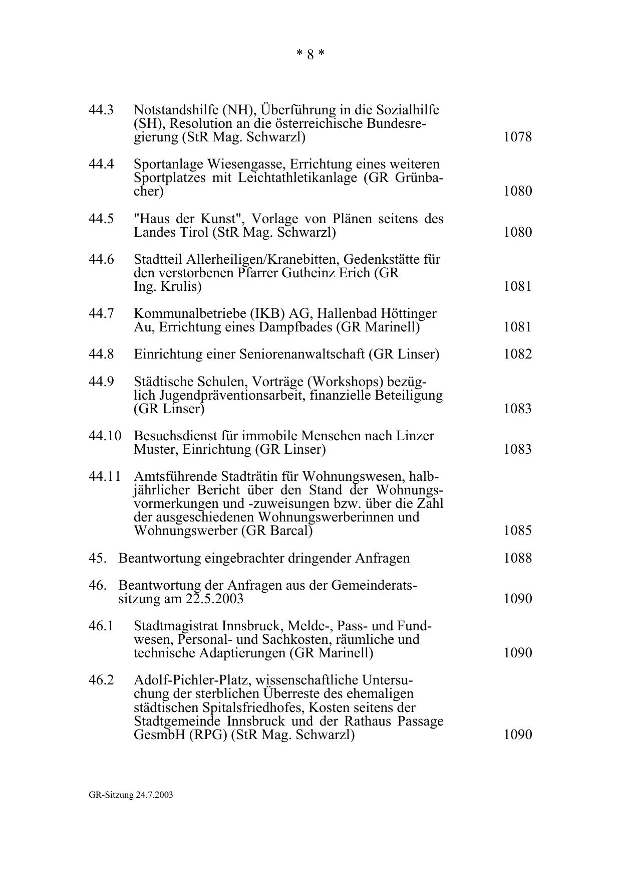 46. Beantwortung der Anfragen aus der Gemeinderatssitzung am 22.5.2003