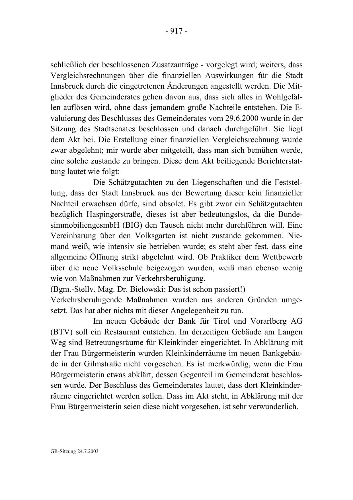 Innsbruck durch die eingetretenen Änderungen angestellt werden. Die Mitglieder des Gemeinderates gehen davon aus, dass sich alles in Wohlgefallen auflösen wird, ohne dass jemandem große Nachteile entstehen. Die Evaluierung des Beschlusses des Gemeinderates vom 29.6.2000 wurde in der