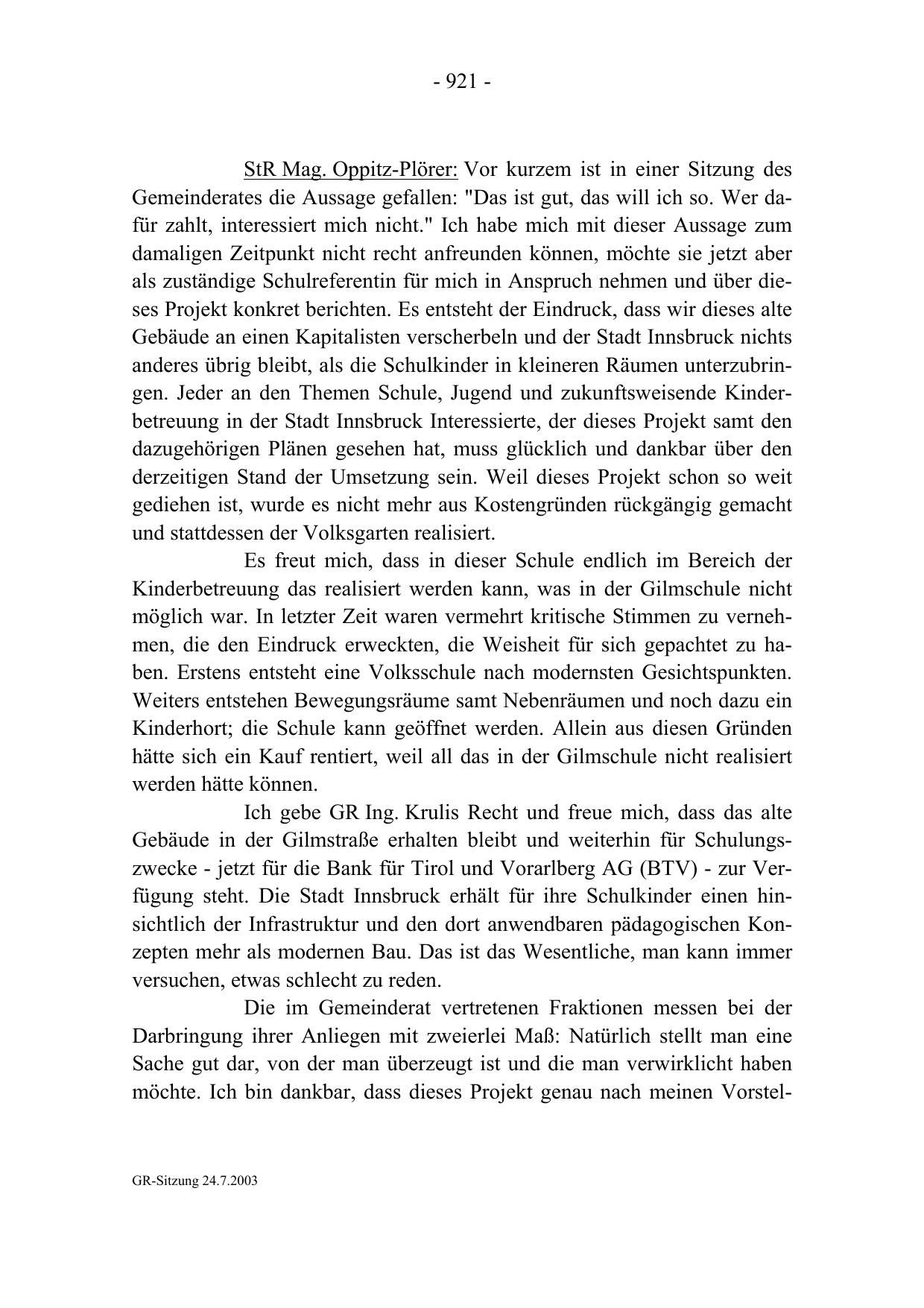 Gebäude in der Gilmstraße erhalten bleibt und weiterhin für Schulungszwecke - jetzt für die Bank für Tirol und Vorarlberg AG (BTV) - zur Verfügung steht. Die Stadt Innsbruck erhält für ihre Schulkinder einen hinsichtlich der Infrastruktur und den dort anwendbaren pädagogischen Konzepten mehr als modernen Bau. Das ist das Wesentliche, man kann immer