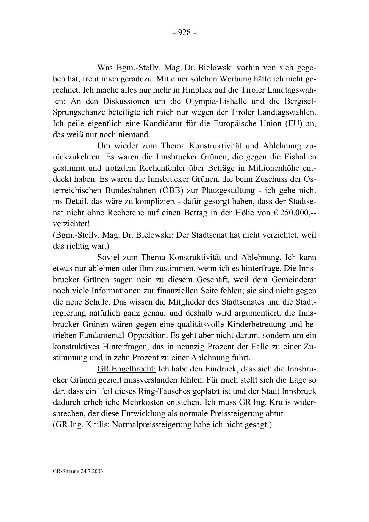 Was Bgm.-Stellv. Mag. Dr. Bielowski vorhin von sich gegeben hat, freut mich geradezu. Mit einer solchen Werbung hätte ich nicht gerechnet. Ich mache alles nur mehr in Hinblick auf die Tiroler Landtagswahlen: An den Diskussionen um die Olympia-Eishalle und die BergiselSprungschanze beteiligte ich mich nur wegen der Tiroler Landtagswahlen.