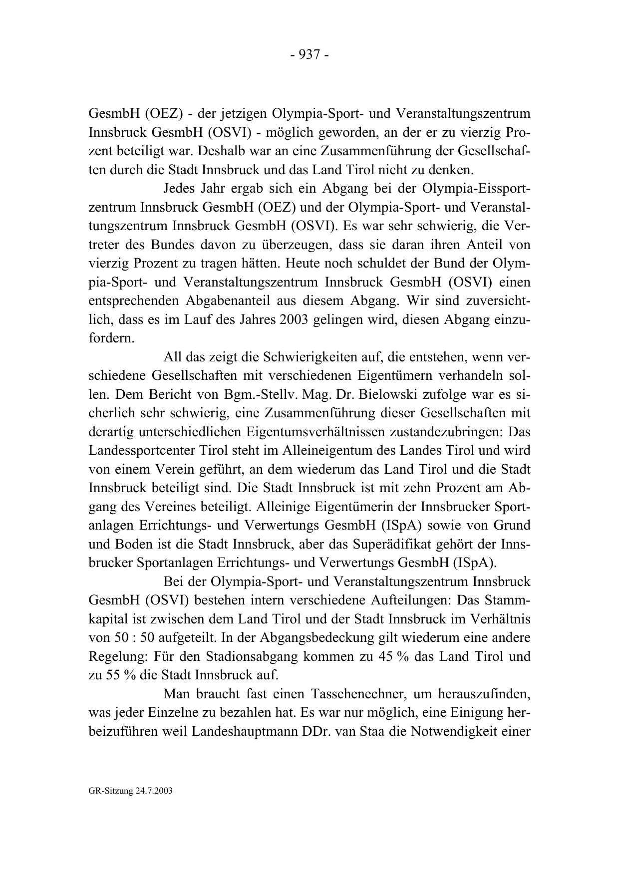 Innsbruck GesmbH (OSVI) - möglich geworden, an der er zu vierzig Prozent beteiligt war. Deshalb war an eine Zusammenführung der Gesellschaften durch die Stadt Innsbruck und das Land Tirol nicht zu denken.