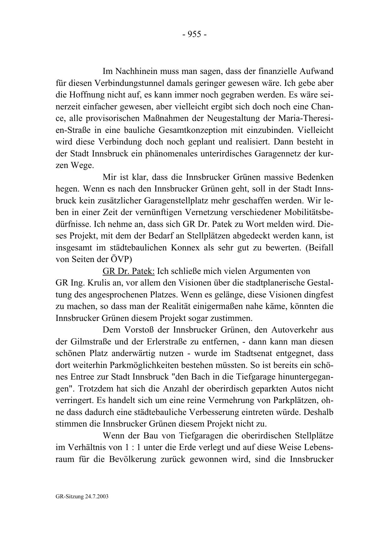 hegen. Wenn es nach den Innsbrucker Grünen geht, soll in der Stadt Innsbruck kein zusätzlicher Garagenstellplatz mehr geschaffen werden. Wir leben in einer Zeit der vernünftigen Vernetzung verschiedener Mobilitätsbedürfnisse. Ich nehme an, dass sich GR Dr. Patek zu Wort melden wird. Dieses Projekt, mit dem der Bedarf an Stellplätzen abgedeckt werden kann, ist