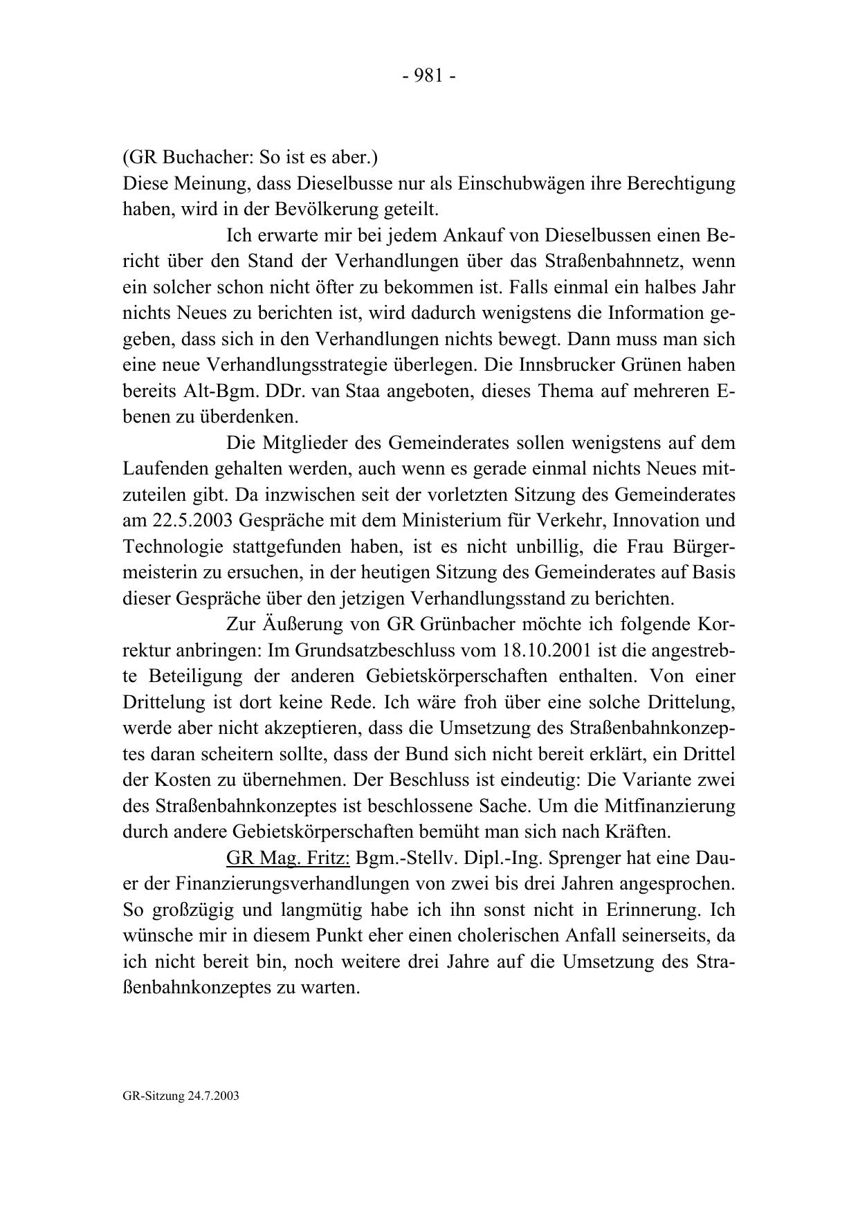 Zur Äußerung von GR Grünbacher möchte ich folgende Korrektur anbringen: Im Grundsatzbeschluss vom 18.10.2001 ist die angestrebte Beteiligung der anderen Gebietskörperschaften enthalten. Von einer