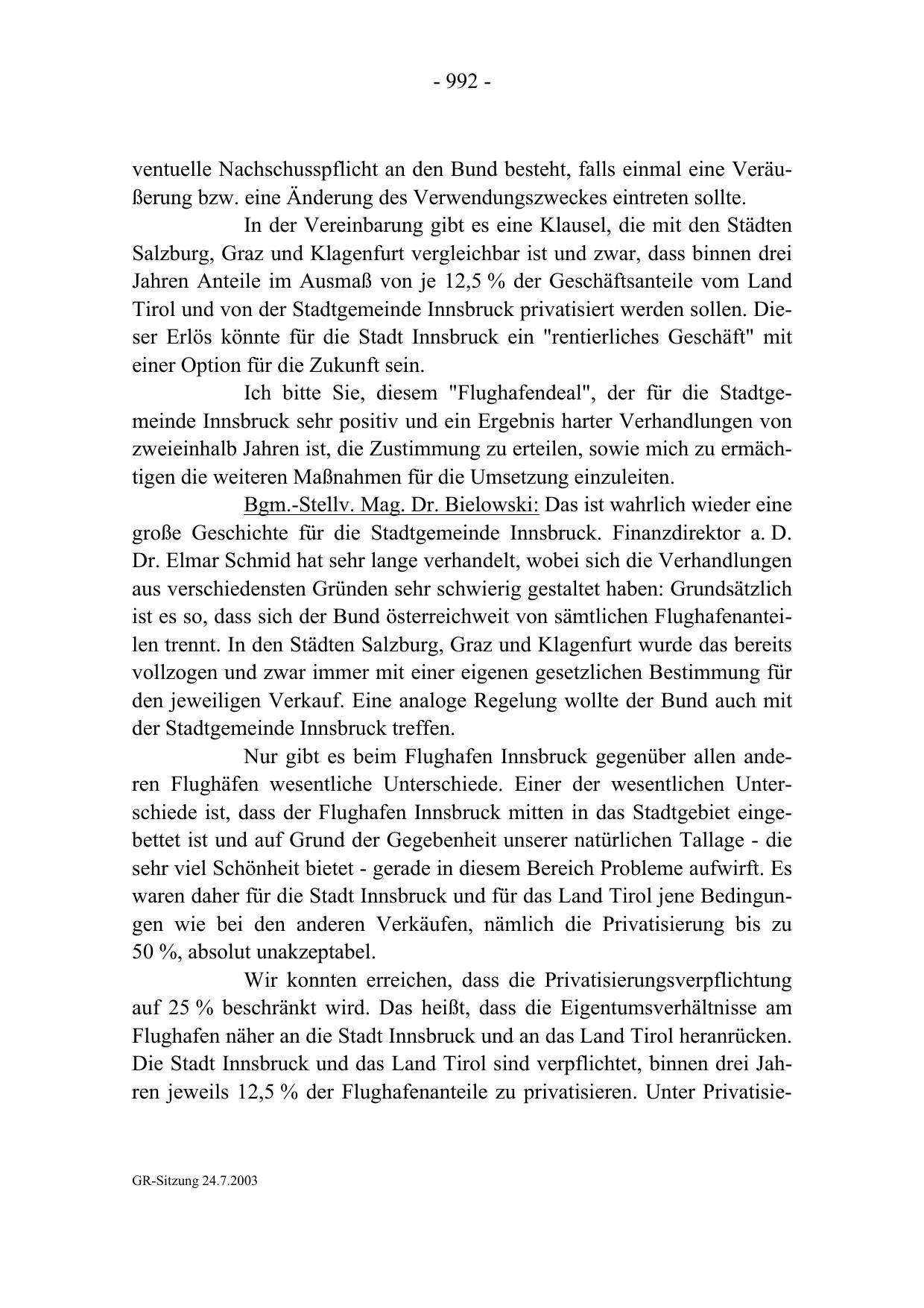 waren daher für die Stadt Innsbruck und für das Land Tirol jene Bedingungen wie bei den anderen Verkäufen, nämlich die Privatisierung bis zu