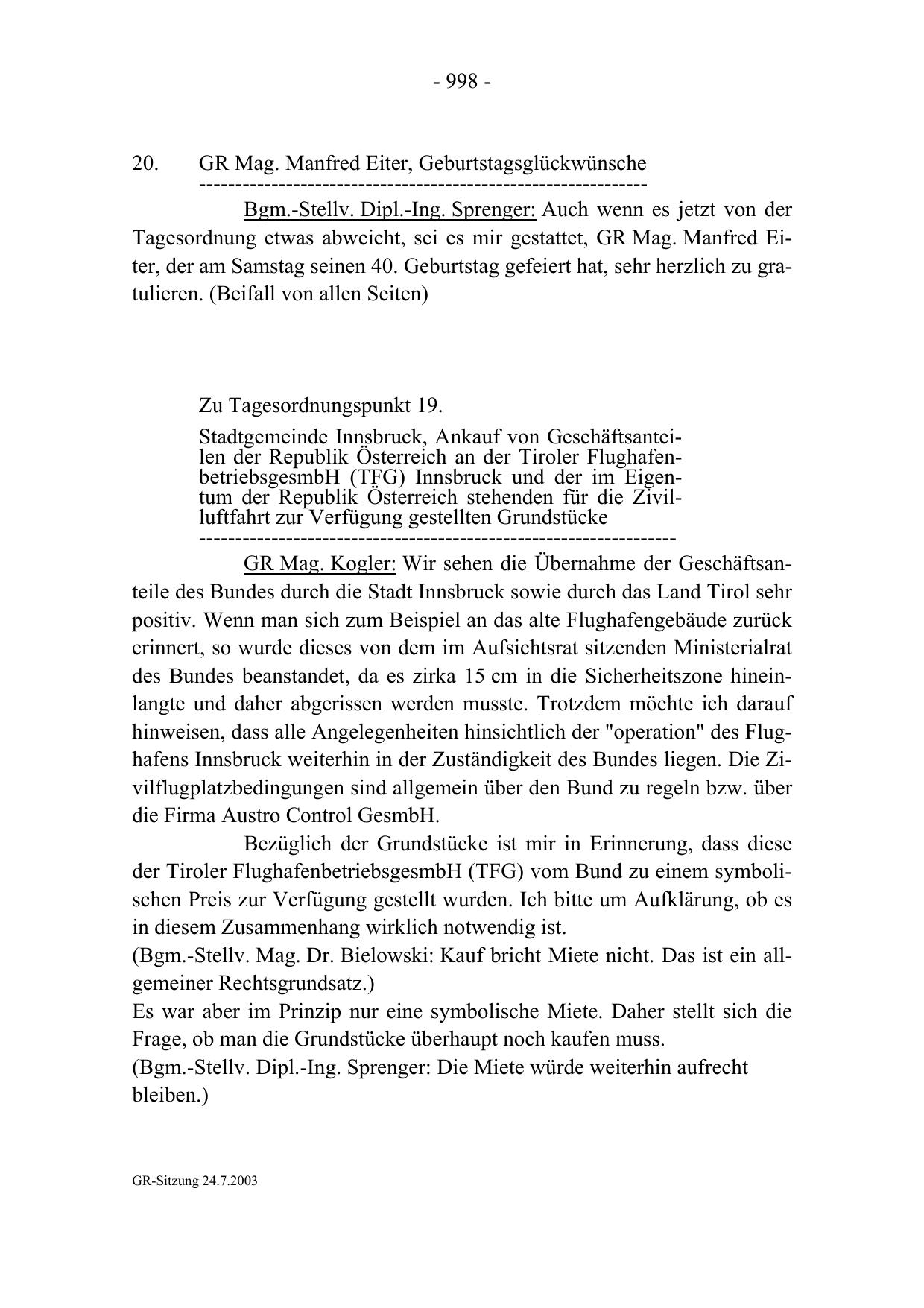 Stadtgemeinde Innsbruck, Ankauf von Geschäftsanteilen der Republik Österreich an der Tiroler FlughafenbetriebsgesmbH (TFG) Innsbruck und der im Eigentum der Republik Österreich stehenden für die Zivilluftfahrt zur Verfügung gestellten Grundstücke