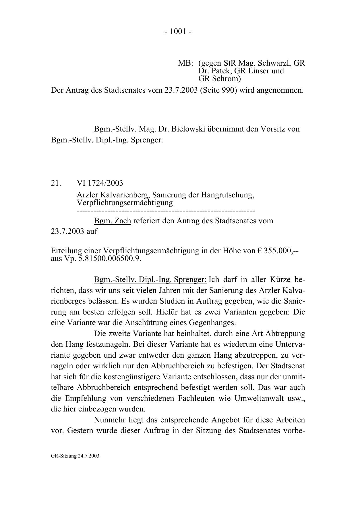 vor. Gestern wurde dieser Auftrag in der Sitzung des Stadtsenates vorbeGR-Sitzung 24.7.2003