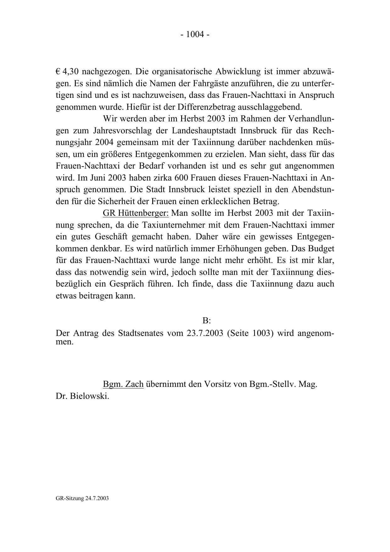 Der Antrag des Stadtsenates vom 23.7.2003 (Seite 1003) wird angenommen.