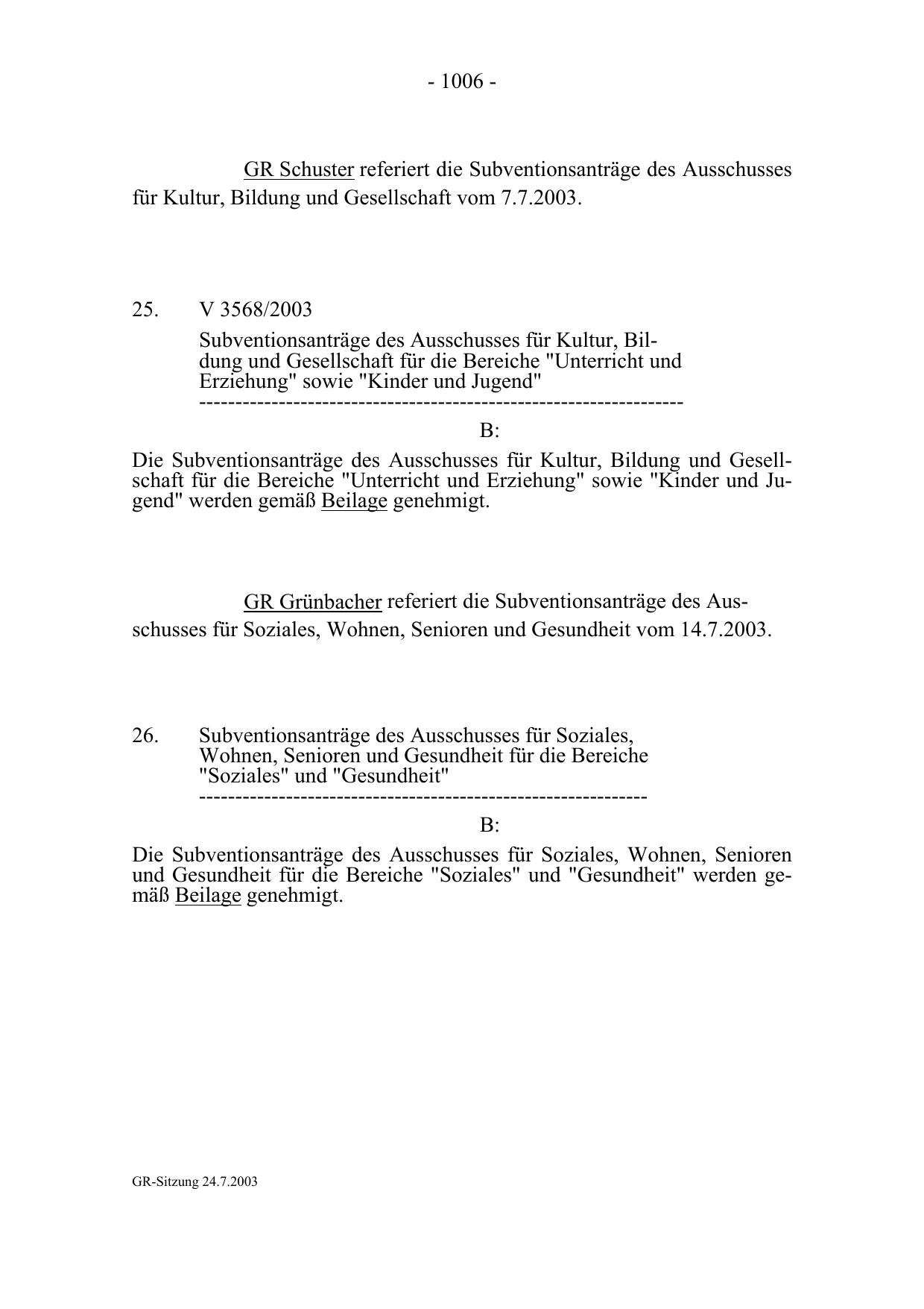 GR Grünbacher referiert die Subventionsanträge des Ausschusses für Soziales, Wohnen, Senioren und Gesundheit vom 14.7.2003.