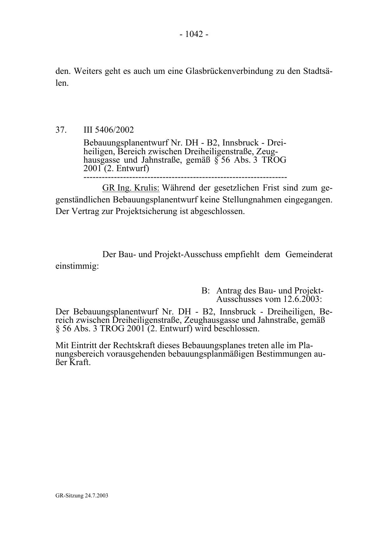 Bebauungsplanentwurf Nr. DH - B2, Innsbruck - Dreiheiligen, Bereich zwischen Dreiheiligenstraße, Zeughausgasse und Jahnstraße, gemäß § 56 Abs. 3 TROG