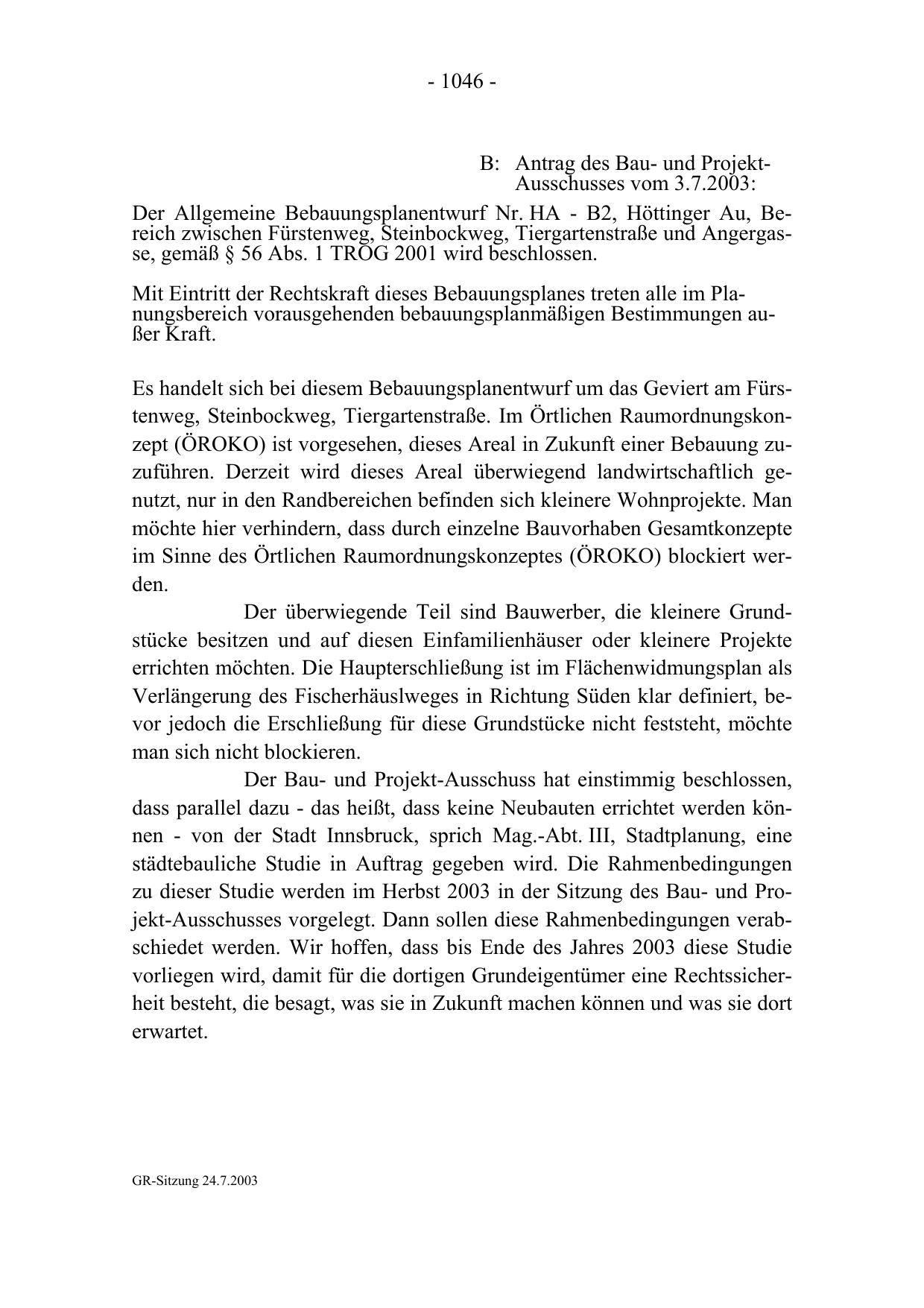 B: Antrag des Bau- und ProjektAusschusses vom 3.7.2003:
