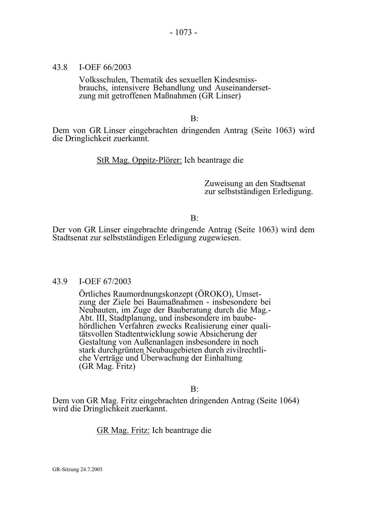 Der von GR Linser eingebrachte dringende Antrag (Seite 1063) wird dem