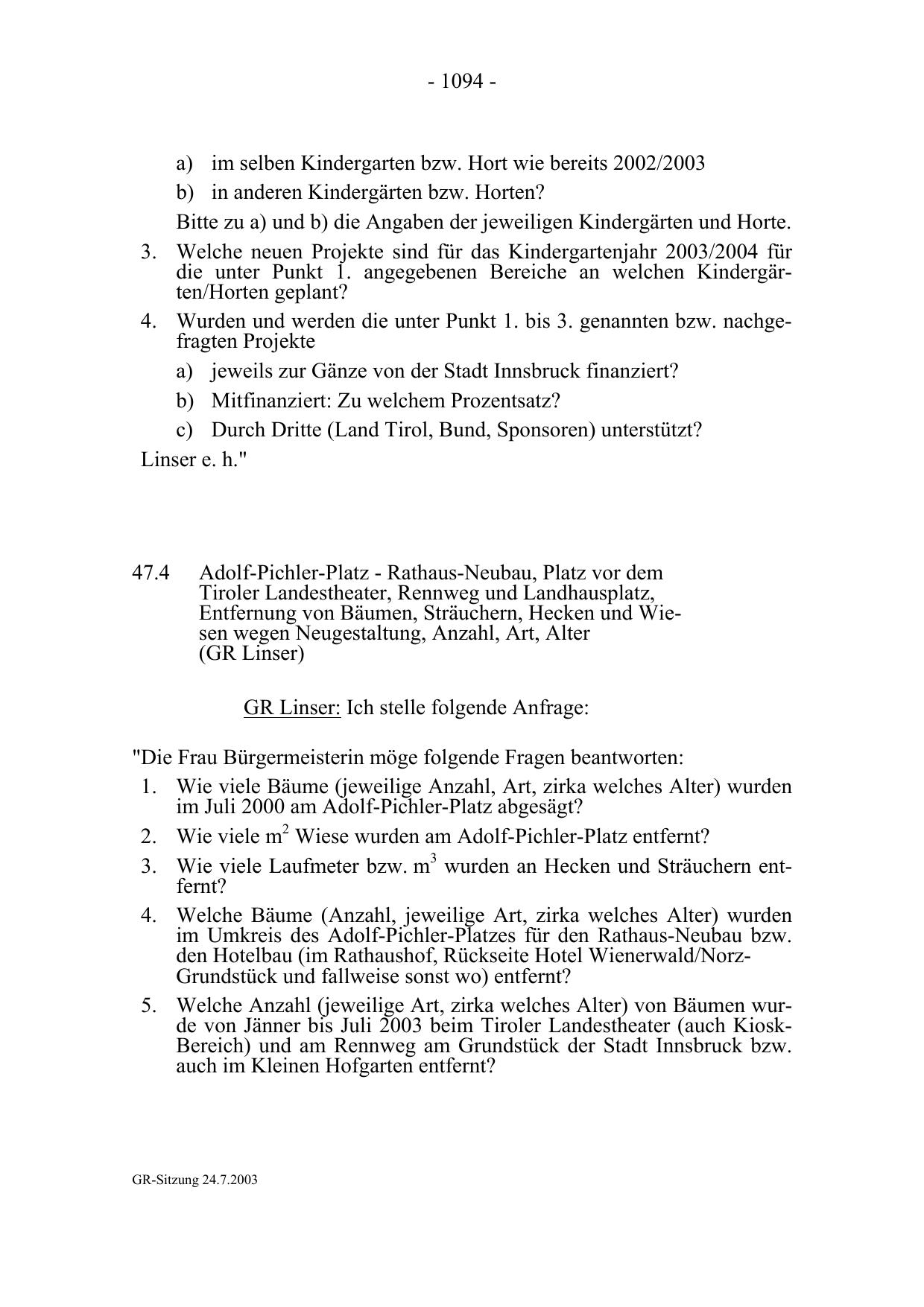 5. Welche Anzahl (jeweilige Art, zirka welches Alter) von Bäumen wurde von Jänner bis Juli 2003 beim Tiroler Landestheater (auch KioskBereich) und am Rennweg am Grundstück der Stadt Innsbruck bzw.