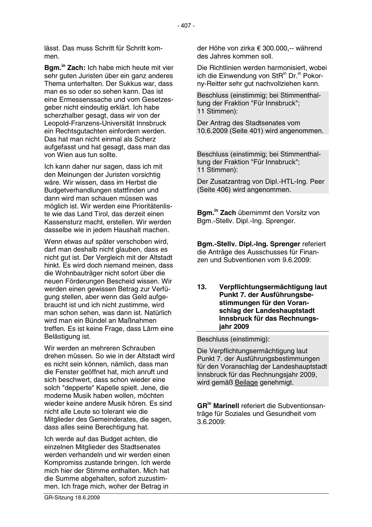 Beschluss (einstimmig; bei Stimmenthaltung der Fraktion "Für Innsbruck";