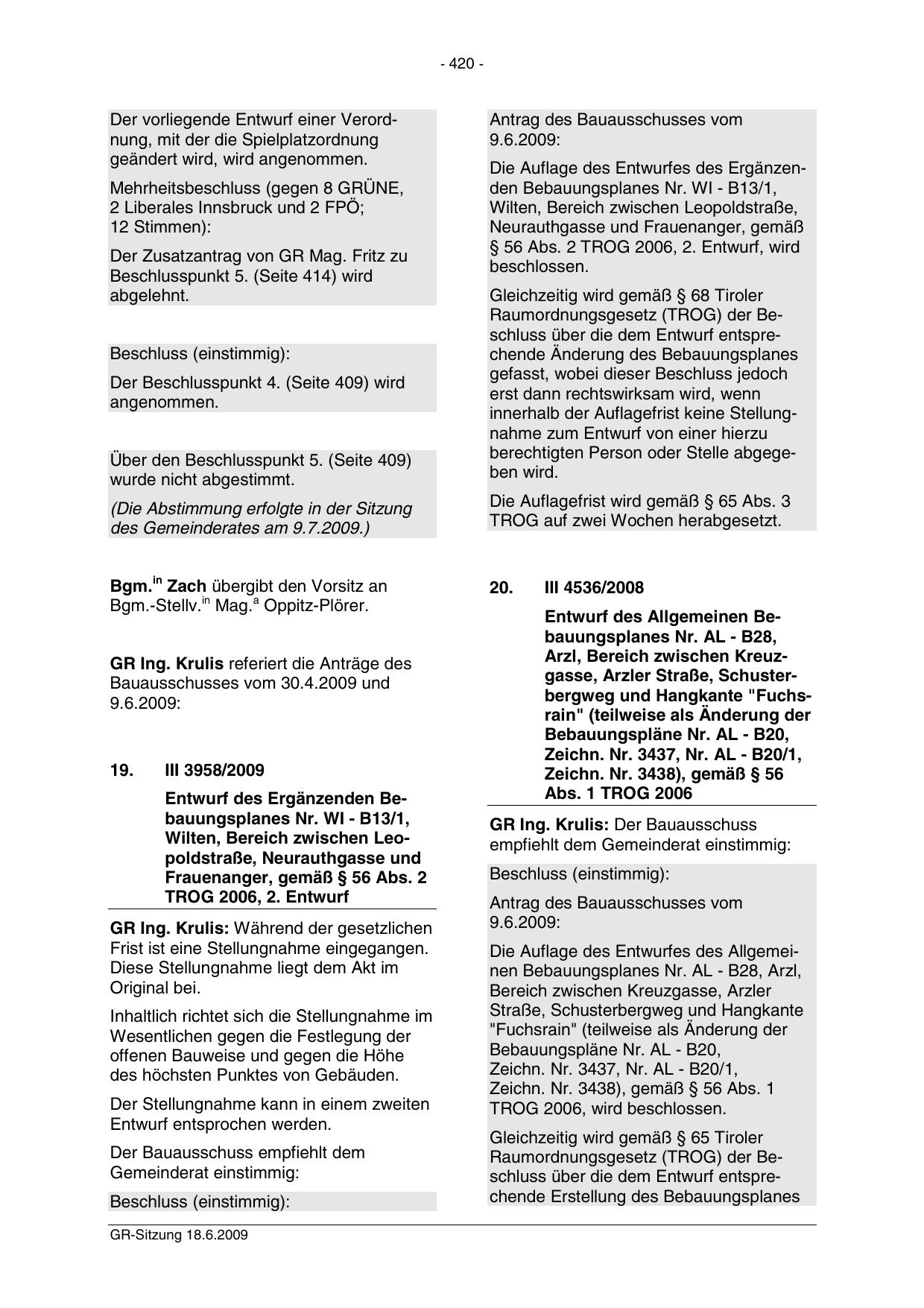 Raumordnungsgesetz (TROG) der Beschluss über die dem Entwurf entsprechende Erstellung des Bebauungsplanes